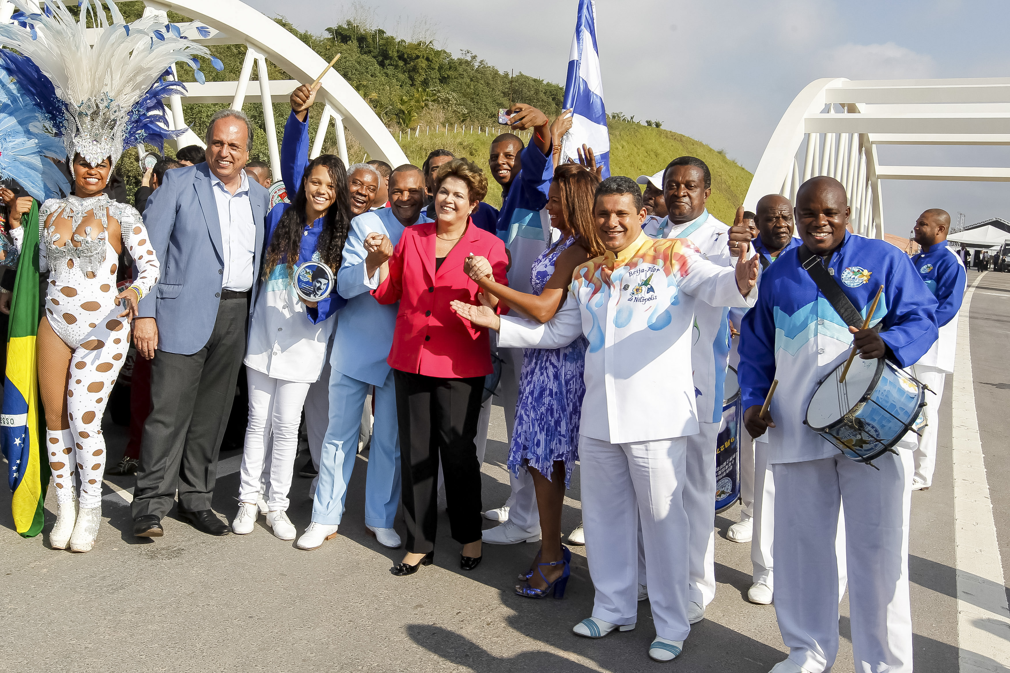 Presidenta Dilma Rousseff posa para fotos com integrantes da Escola de Samba Beija Flor de Nilópolis, durante abertura ao tráfego do Arco Metropolitano do Rio de Janeiro, assinatura de contrato de financiamento para abastecimento de água na Baixada Fluminense e anúncio de novos investimentos. (Duque de Caxias - RJ, 01/07/2014)