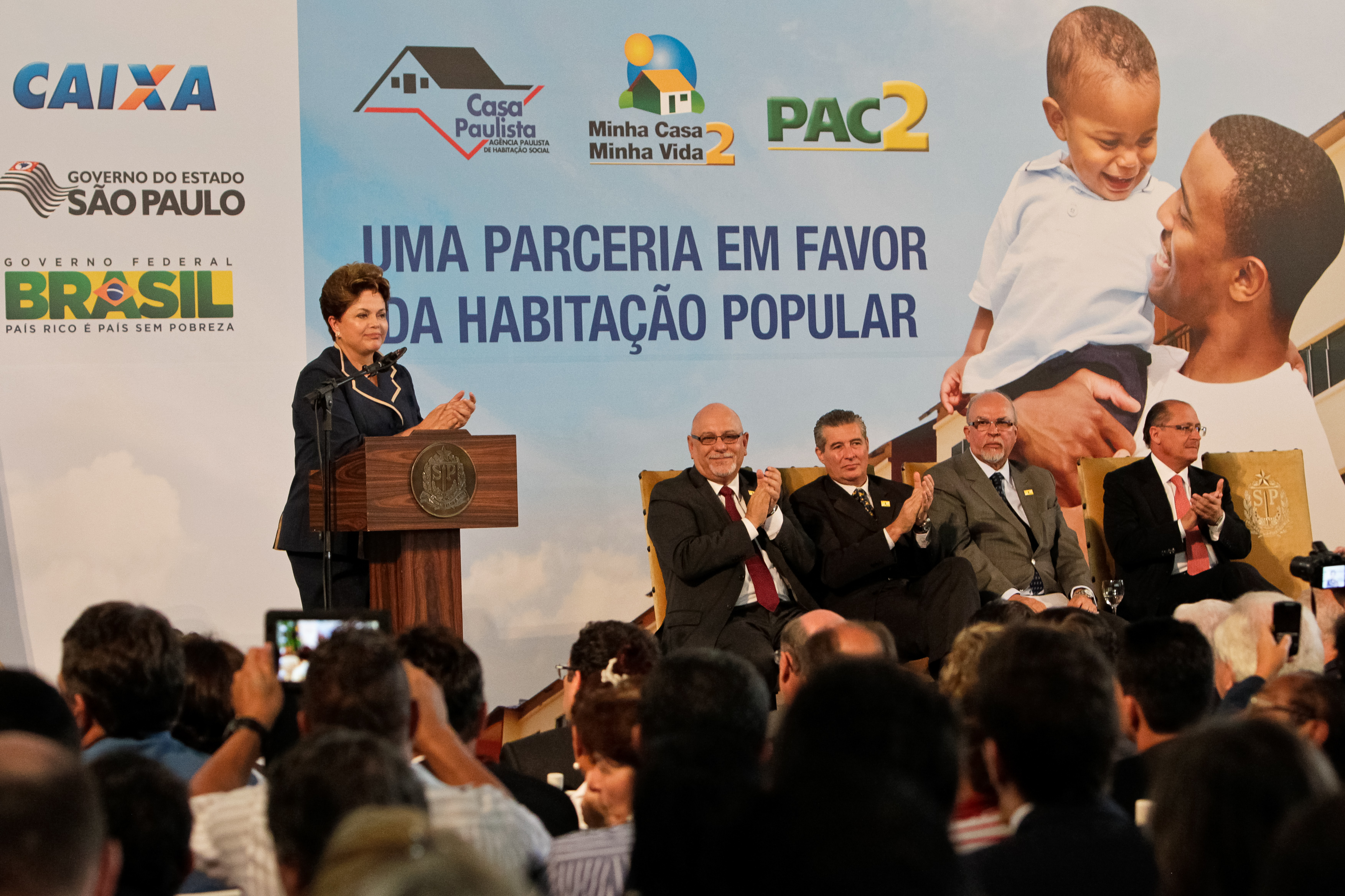Presidenta Dilma Rousseff durante Cerimônia de assinatura do termo de adesão ao programa Minha Casa, Minha Vida pelo Governo do Estado de São Paulo e do termo de compromisso para a construção de 97 mil unidades habitacionais da faixa I. (São Paulo - SP, 12/01/2012)