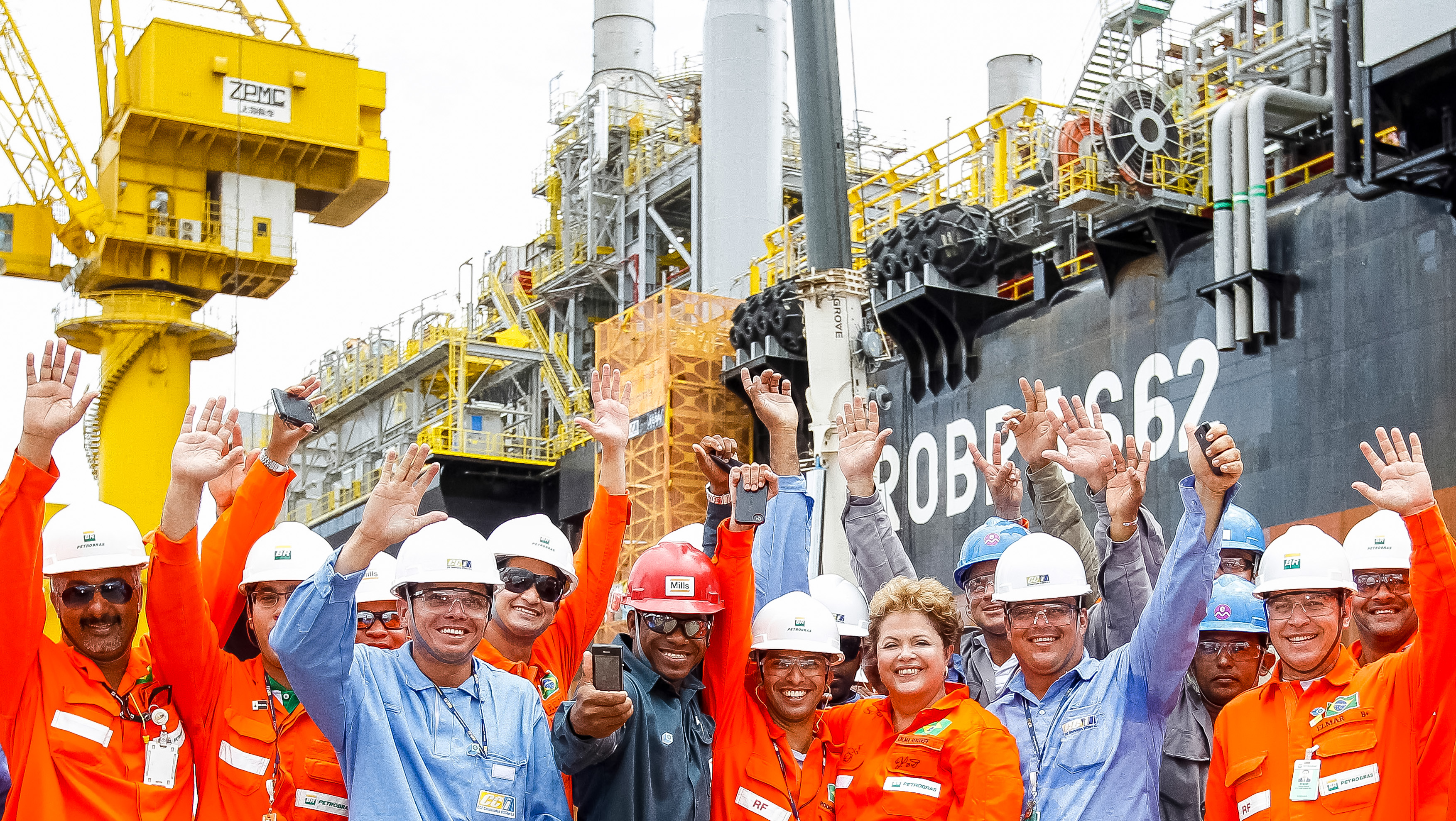 Presidenta Dilma Rousseff posa para foto com trabalhadores durante cerimônia de conclusão das obras da plataforma P-62 no Estaleiro Atlântico Sul. (Ipojuca - PE, 17/12/2013)