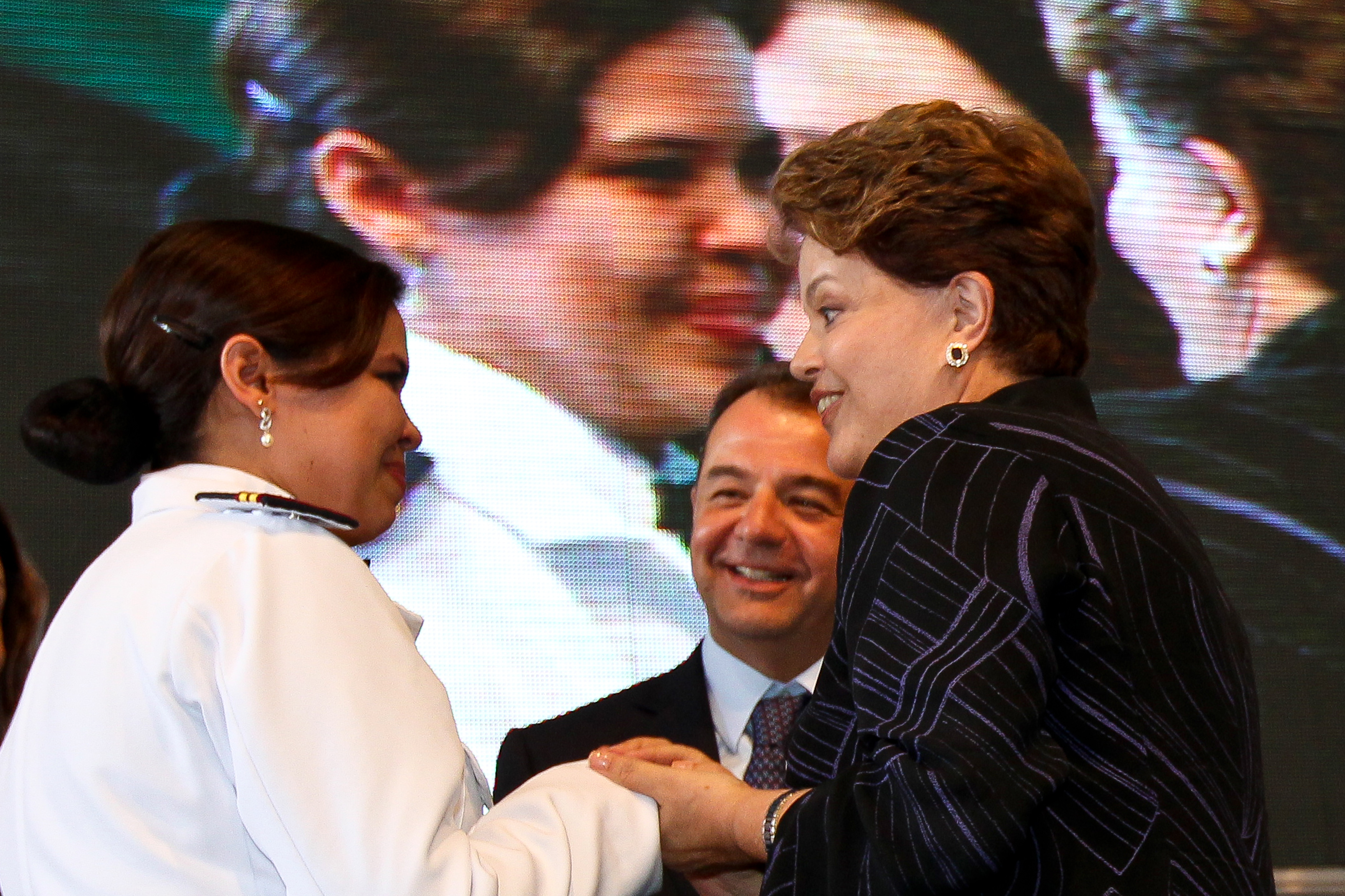 Presidenta Dilma Rousseff cumprimenta a subchefe de máquinas do navio Celso Furtado, Alessandra Leão Santos durante entrega do navio Celso Furtado no Estaleiro Mauá. (Niterói - RJ, 25/11/2011)