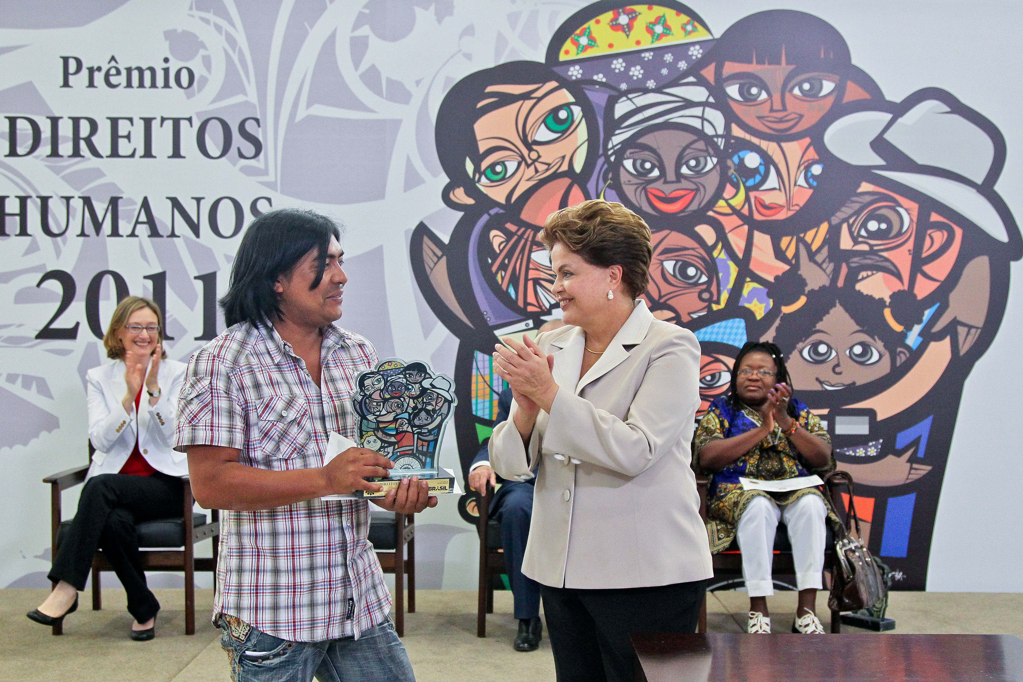 Presidenta Dilma Rousseff entrega o Prêmio Direitos Humanos 2011 na categoria Garantia dos Direitos dos Povos, Comunidade Indígena KAINGANG FÁN NHIN, representado pela Cacique Claudir da Silva. (Brasília - DF, 09/12/2011)