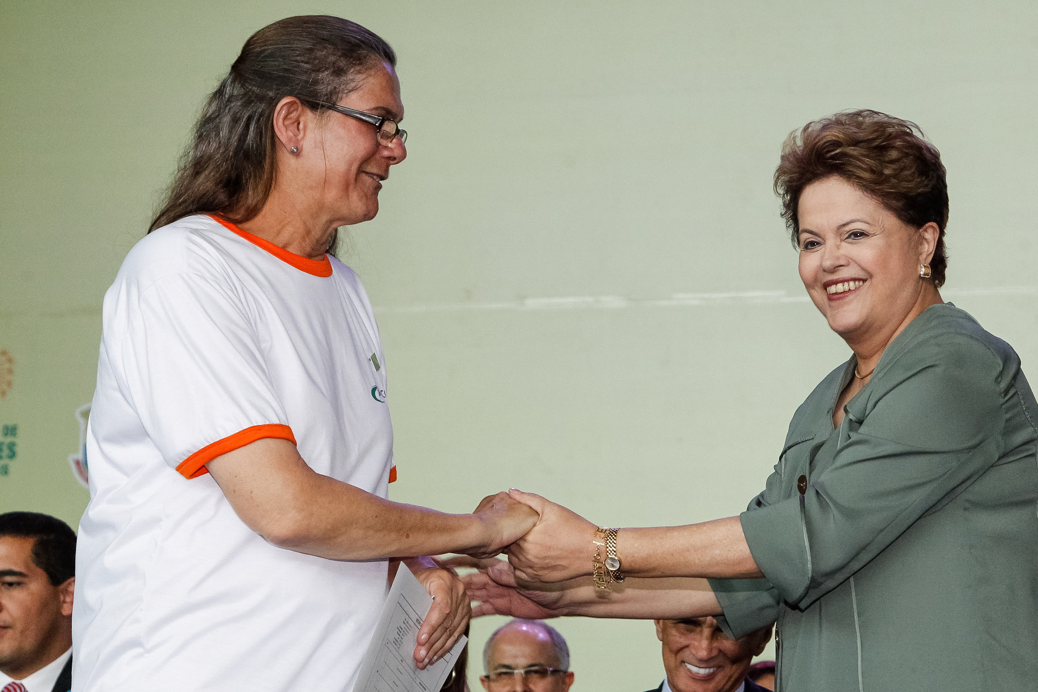 Presidenta Dilma Rousseff durante entrega de diploma e de cartão de identificação ao formando Tiago Henrique Oliveira Rocha, do curso de carpinteiro de obras do SENAI. (Belo Horizonte - MG, 23/10/2013)
