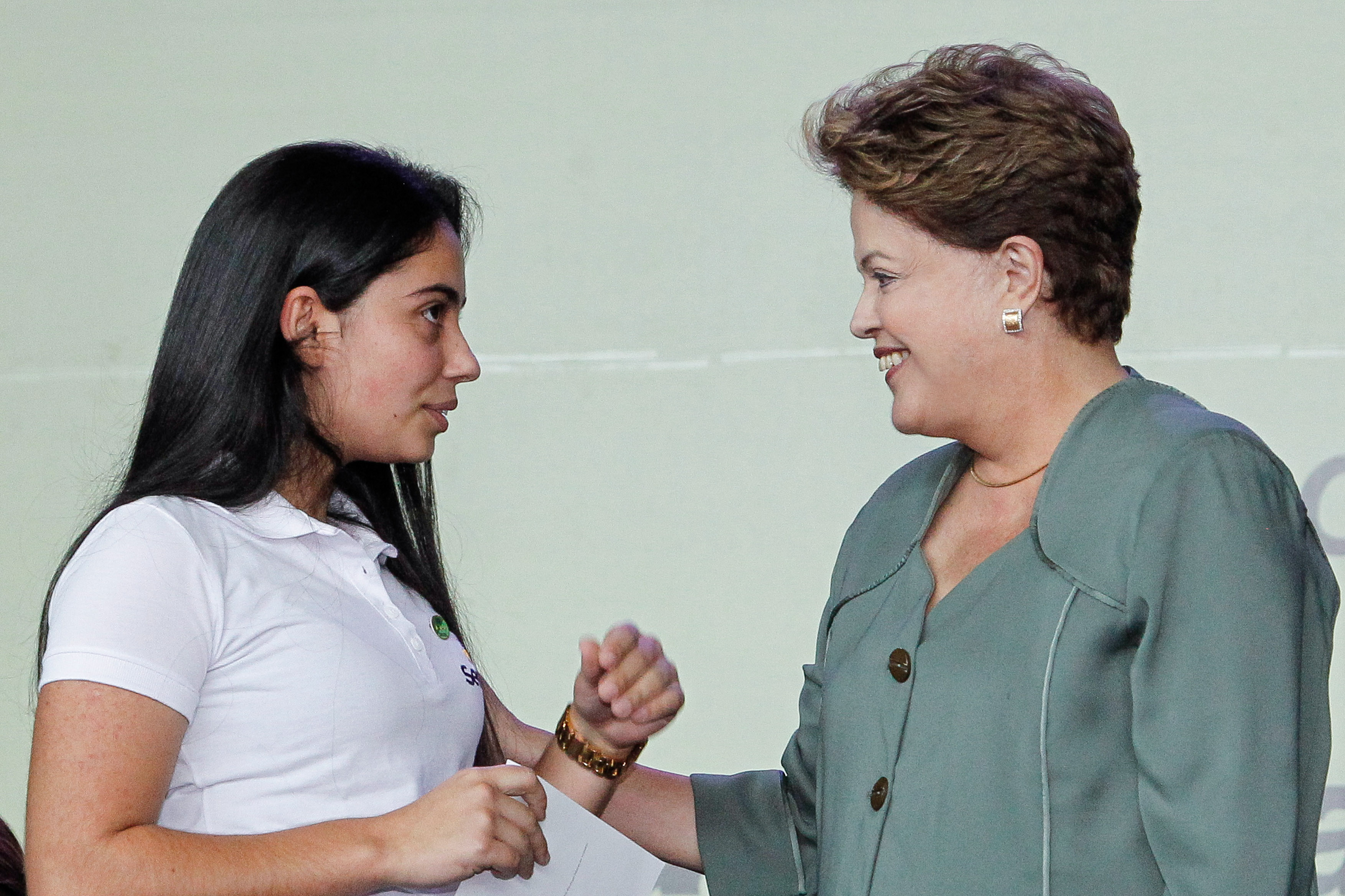 Presidenta Dilma Rousseff durante entrega de diploma e de cartão de identificação ao formando Tiago Henrique Oliveira Rocha, do curso de carpinteiro de obras do SENAI. (Belo Horizonte - MG, 23/10/2013)