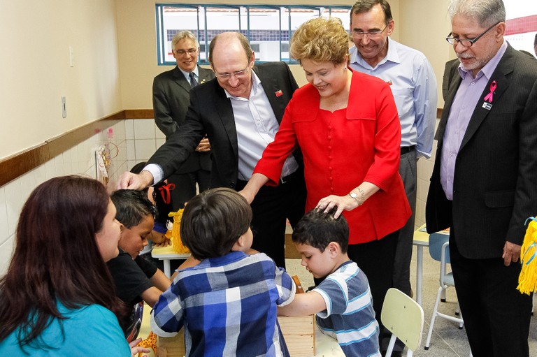 Presidenta Dilma Rousseff assiste às crianças, Ariane Carvalho e Lucas Andrei Schimit, durante declamação de poesia para crianças pequenas, de Dimas Costa, por ocasião da cerimônia de inauguração das Unidades de Educação Infantil dos bairros Kephas, Canudos, Jardim Mauá e Lomba Grande. (Novo Hamburgo - RS, 11/10/2013)