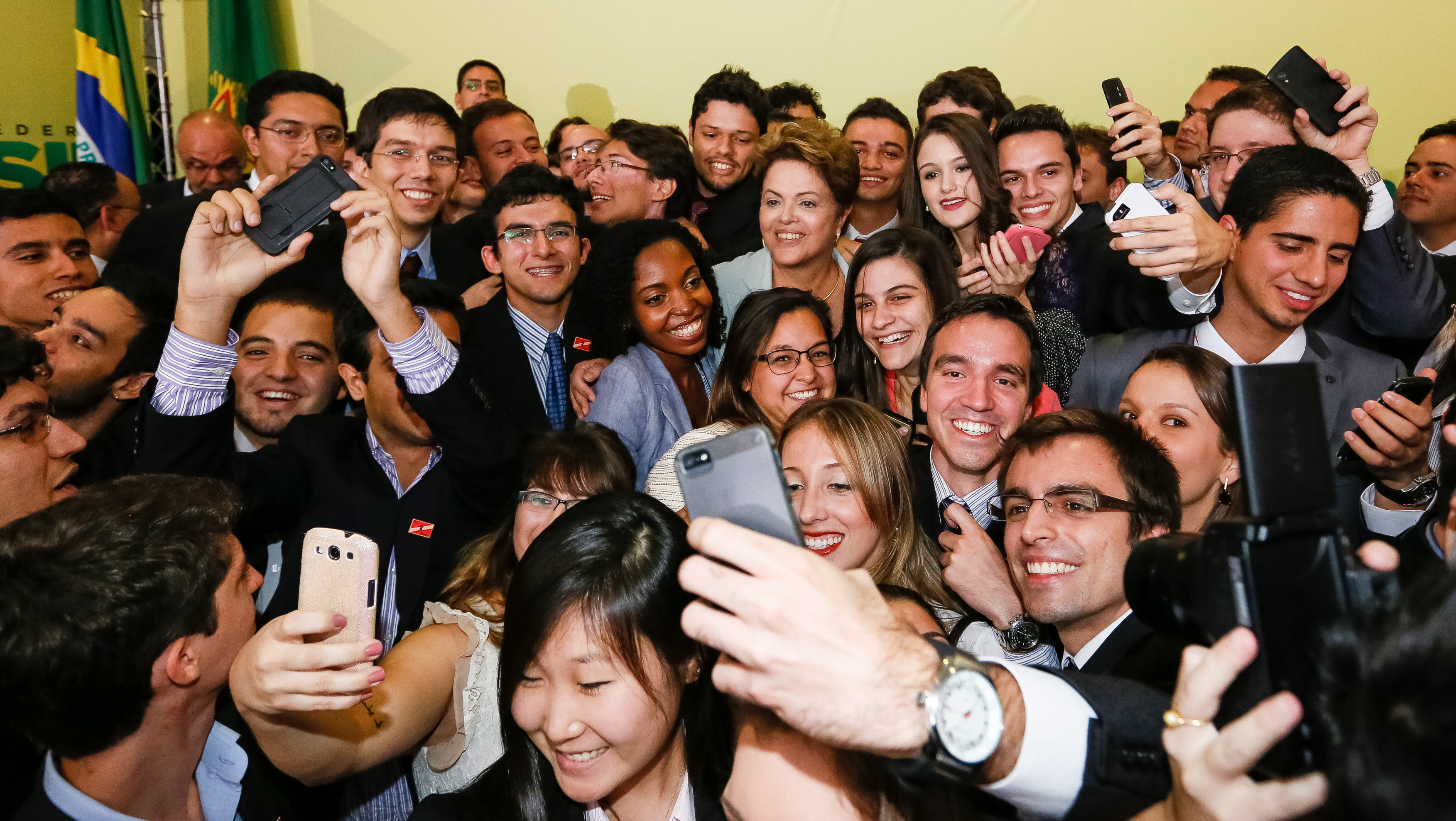 Presidenta Dilma Rousseff posa para foto com estudantes durante cerimônia de lançamento da segunda etapa do Programa Ciência sem Fronteiras. (Brasília - DF, 25/06/2014)