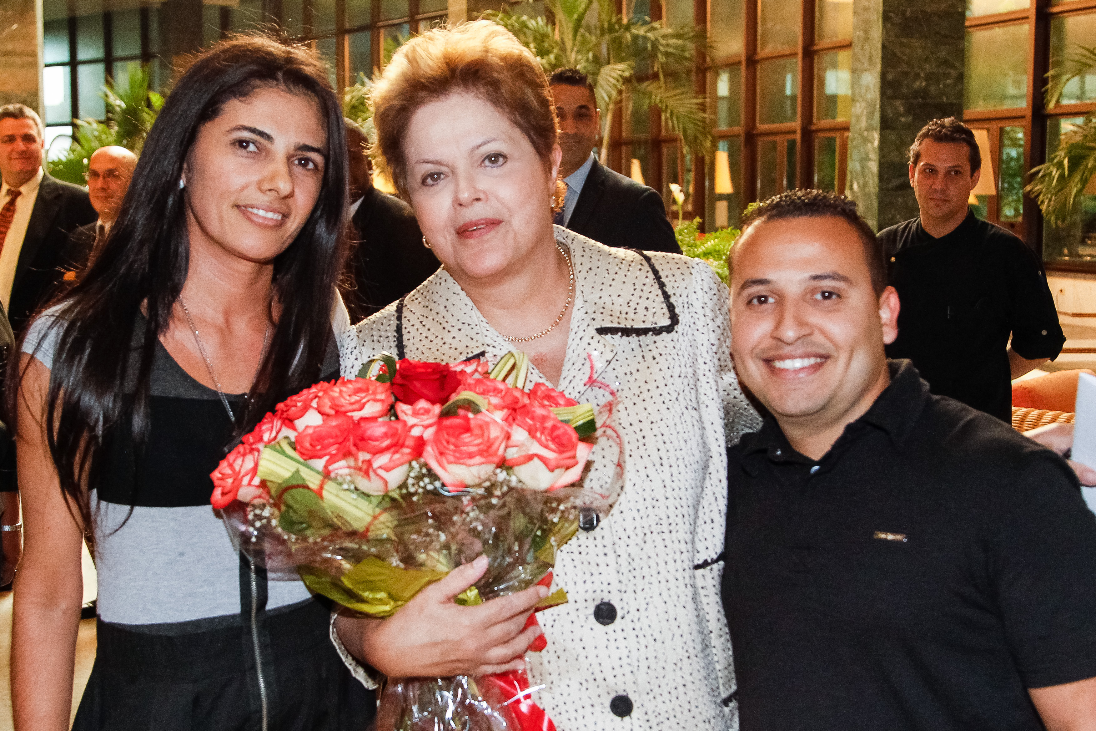 Presidenta Dilma Rousseff recebe cumprimentos dos estudantes do 6º ano da Escola Latino Americana de Medicina, Maria de Fátima Mendonça e Wellington Pedro de Sousa durante chegada no Hotel em Havana - Cuba. (Havana-Cuba, 26/01/2014)