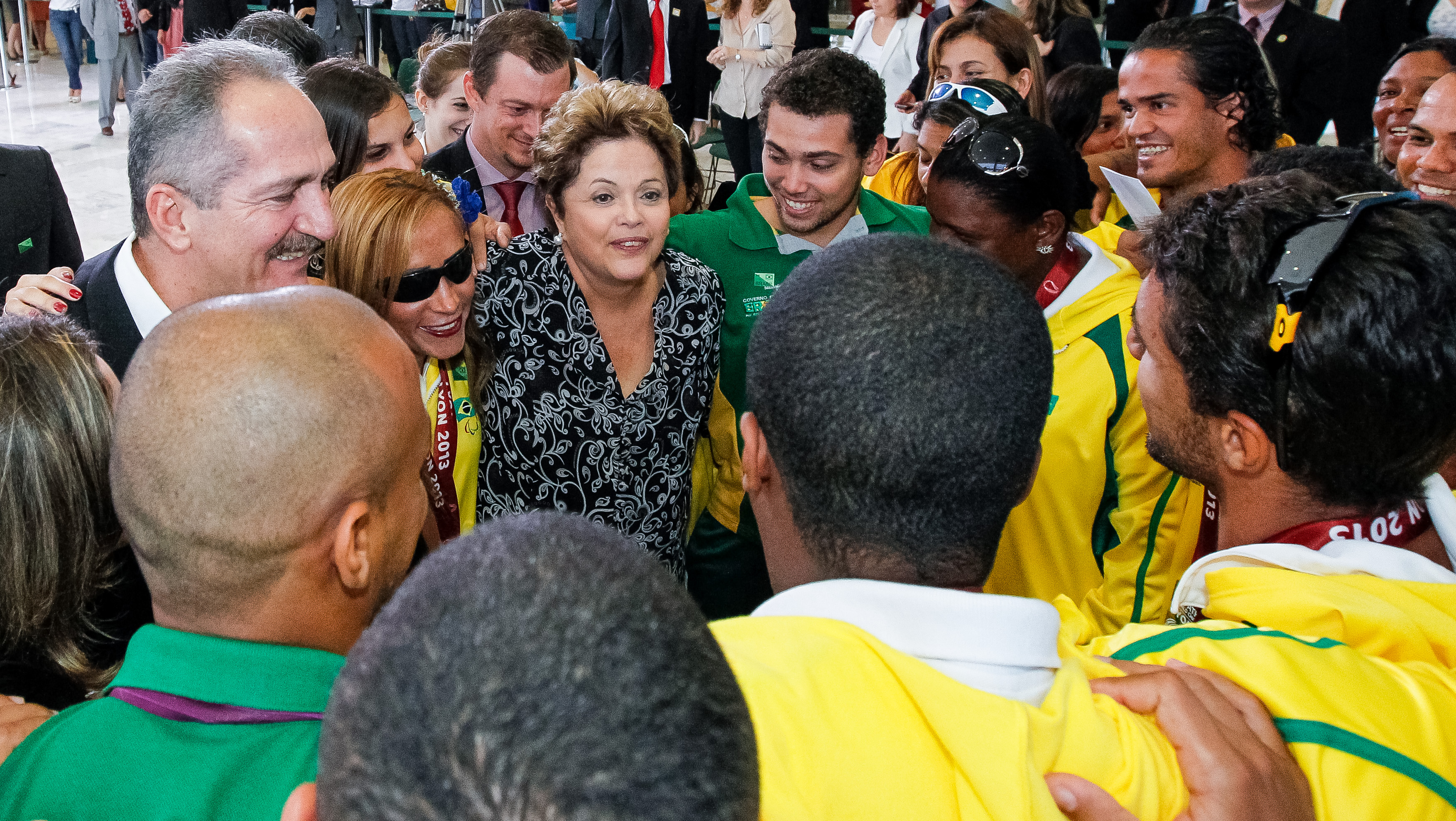 Presidenta Dilma Rousseff e Atletas Paraolímpicos que participaram do Mundial de Atletismo em Lyon na França, durante abraço coletivo. (Brasília - DF, 02/08/2013)
