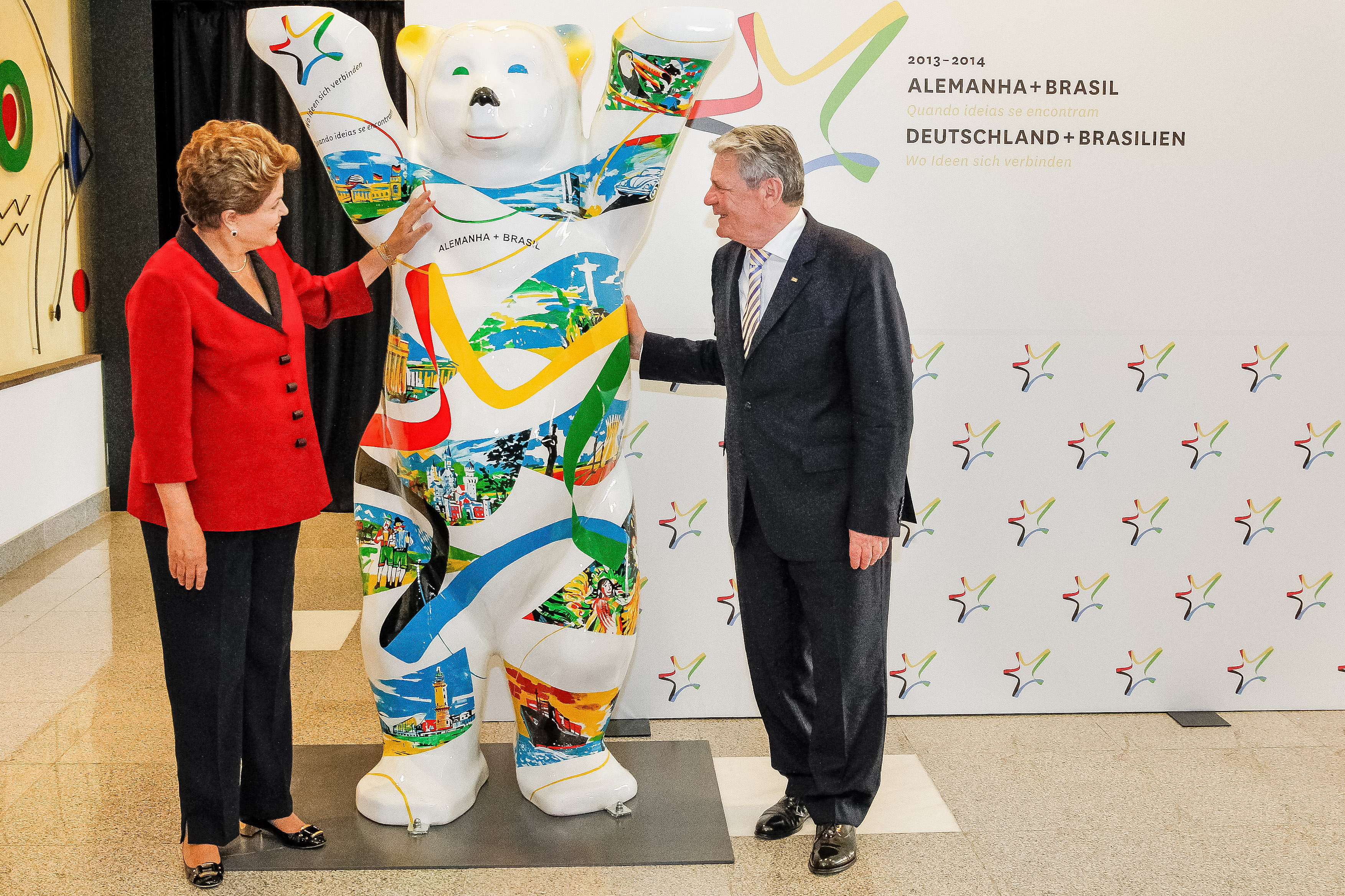 Presidenta Dilma Rousseff é presenteada pelo senhor Joachim Gauck, Presidente da República Federal da Alemanha, com uma escultura de "URSO" , que simboliza a abertura do ano da Alemanha no Brasil. ( São Paulo - SP, 13/05/2013)