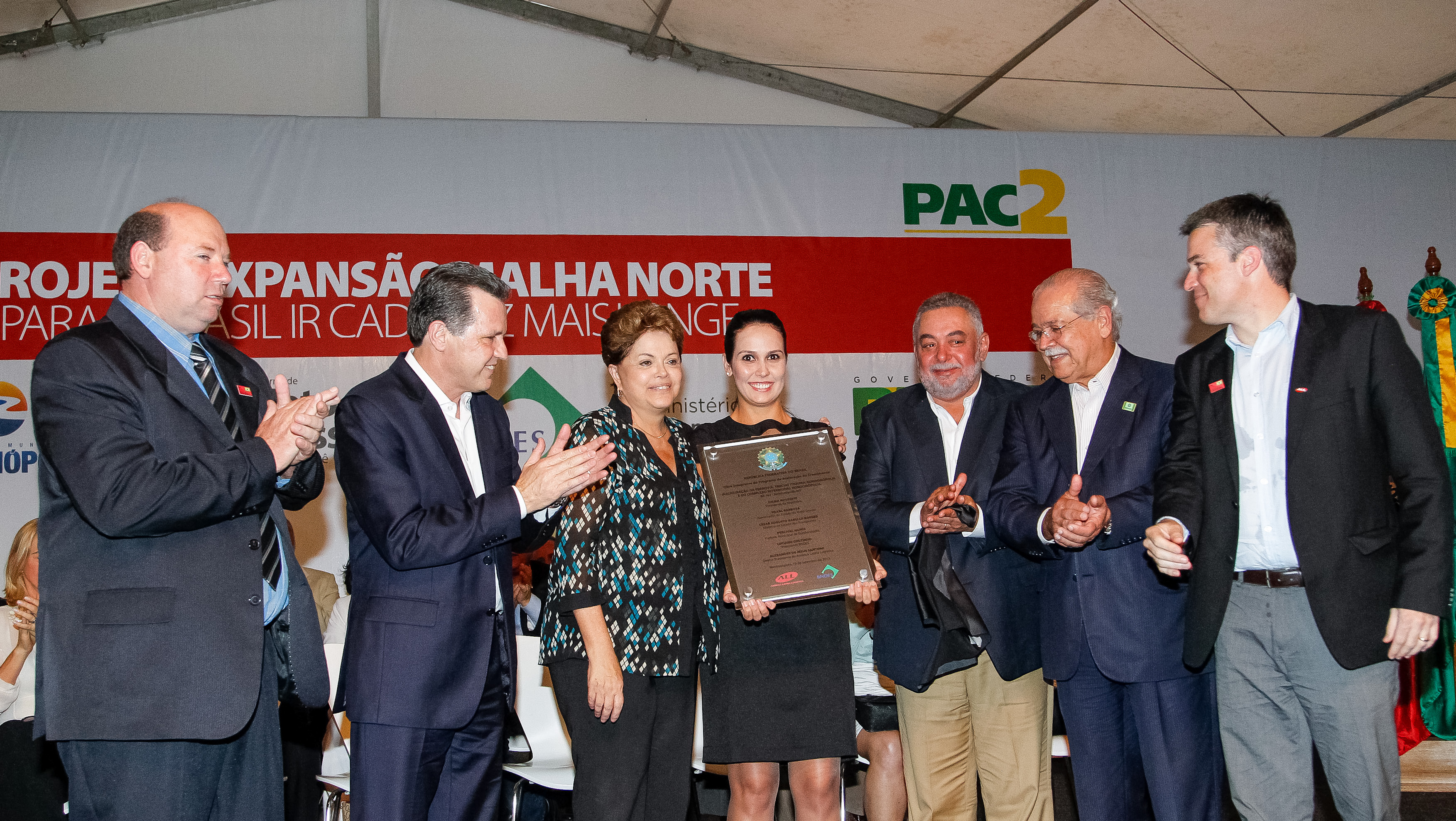 Presidenta Dilma Rousseff descerra placa de inauguração do Projeto Expansão Malha Norte, durante a cerimônia de inauguração do Projeto Expansão Malha Norte – conclusão da Ferronorte e início da operação do Complexo Intermodal de Rondonópolis. (Rondonópolis - MT, 19/09/2013)
