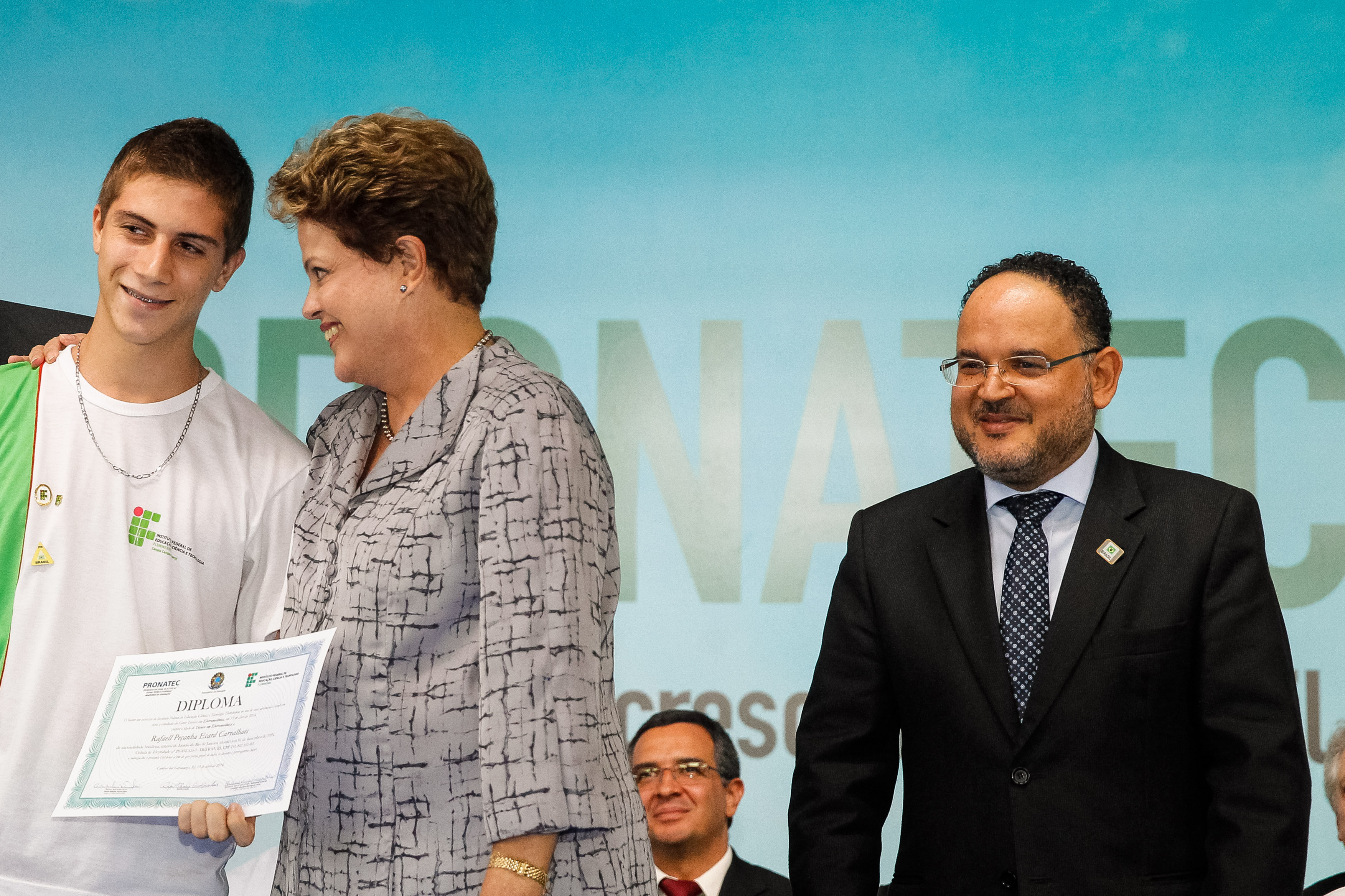 Presidenta Dilma Rousseff entrega o certificado de conclusão do curso técnico em eletromecânica do Instituto Federal Fluminense ao formando, Rafael Peçanha Ecard Carvalhaes, durante cerimônia de formatura do pronatec. (São Gonçalo - RJ, 15/04/2014)