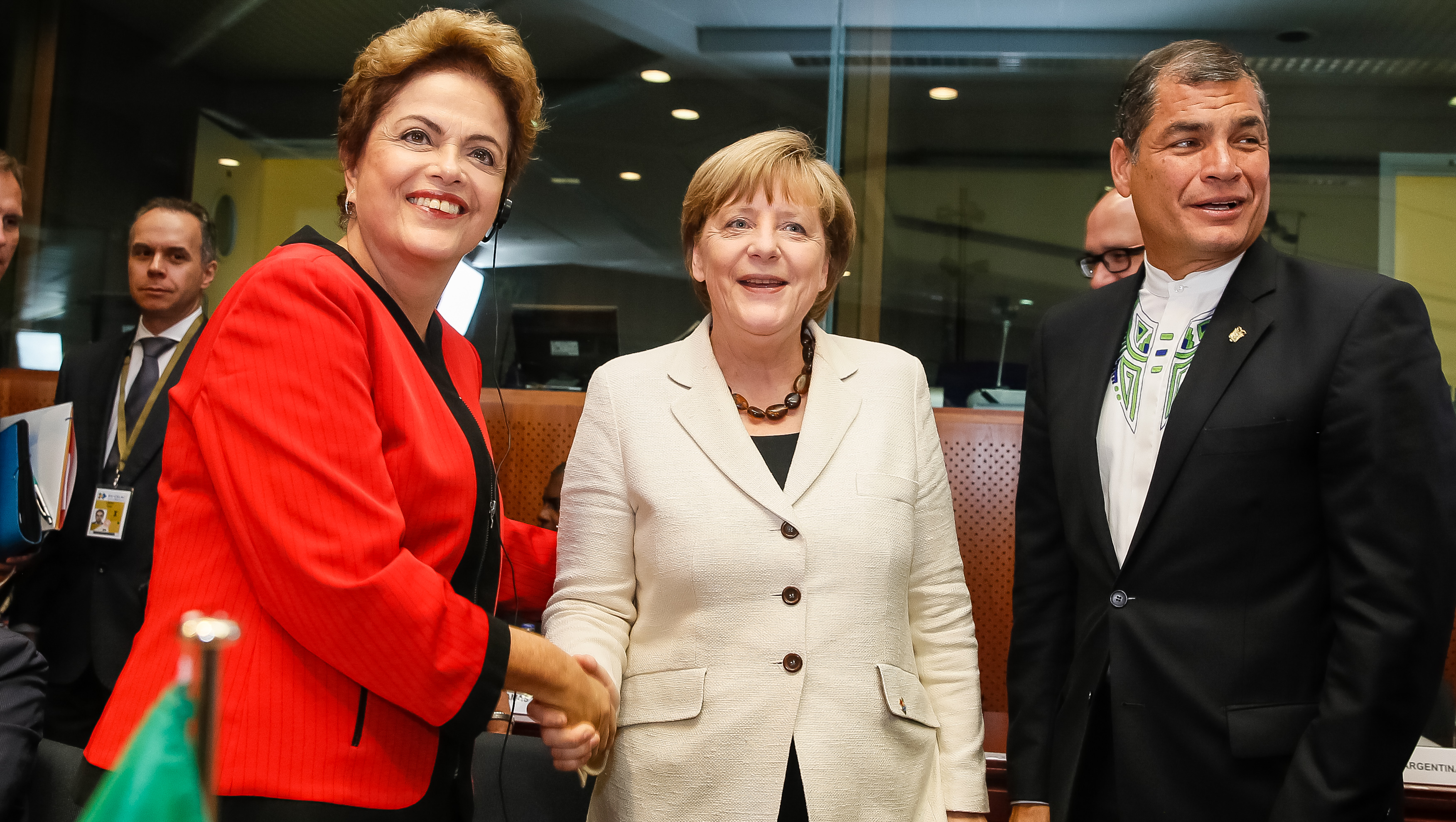 Presidenta Dilma Rousseff cumprimenta a Chanceler da Alemanha, Angela Merkel acompanhada do Presidente do Equador, Rafael Correa durante 1ª sessão da II Cúpula UE-CELAC. (Bruxelas - Bélgica, 10/06/2015)