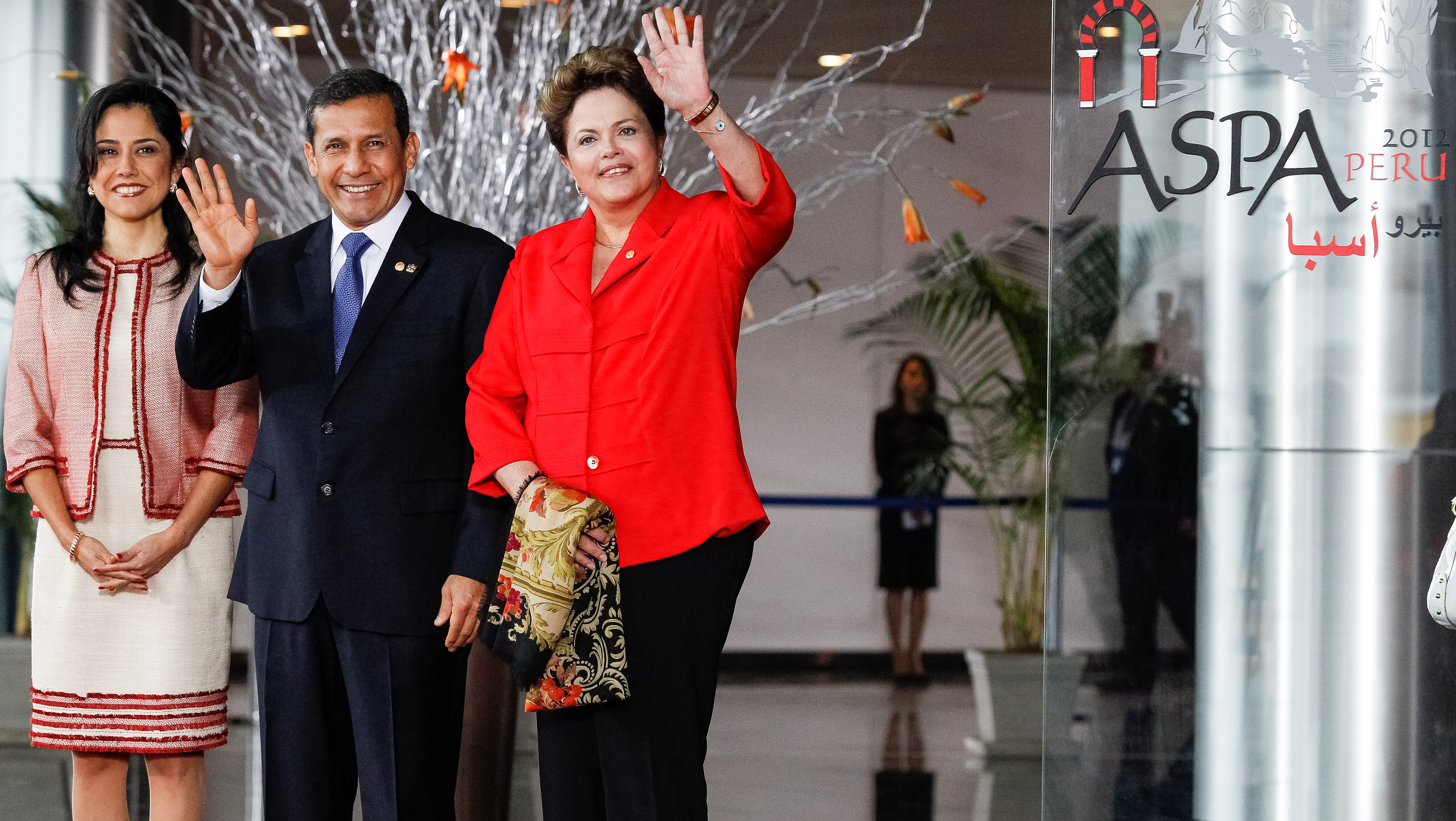 Presidenta Dilma Rousseff recebe os cumprimentos do Presidente do Peru, Ollanta Humala e sua esposa Nadine Heredia durante chegada a cerimônia de abertura da 3ª Cúpula ASPA. (Lima - Peru, 02/10/2012)
