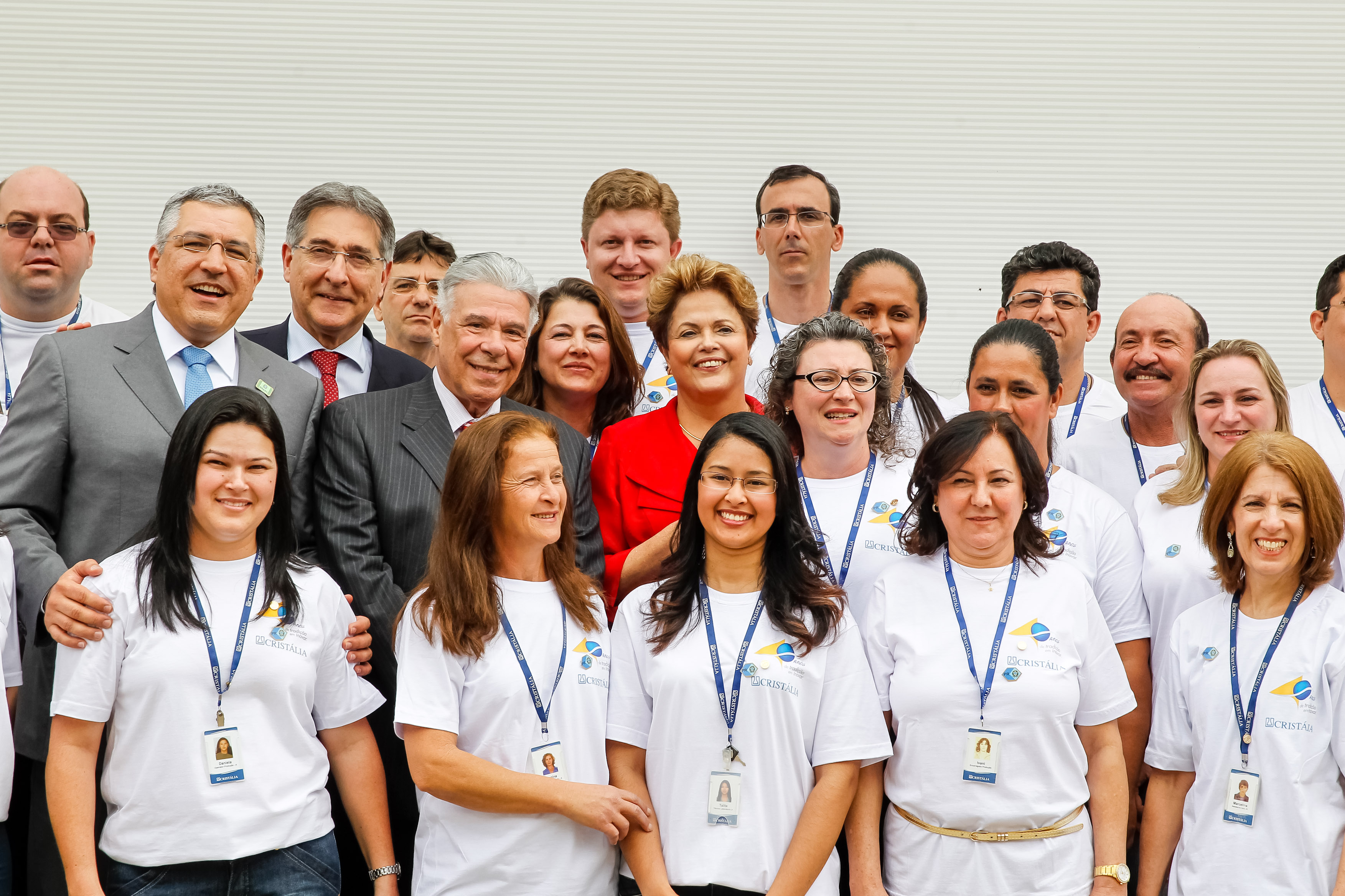 Presidenta Dilma Rousseff posa para foto com trabalhadores durante cerimônia de inauguração da nova fábrica de biotecnologia e de citotásticos e ampliação da farmoquímica do Complexo Industrial Cristália. (Itapira - SP, 13/08/2013)