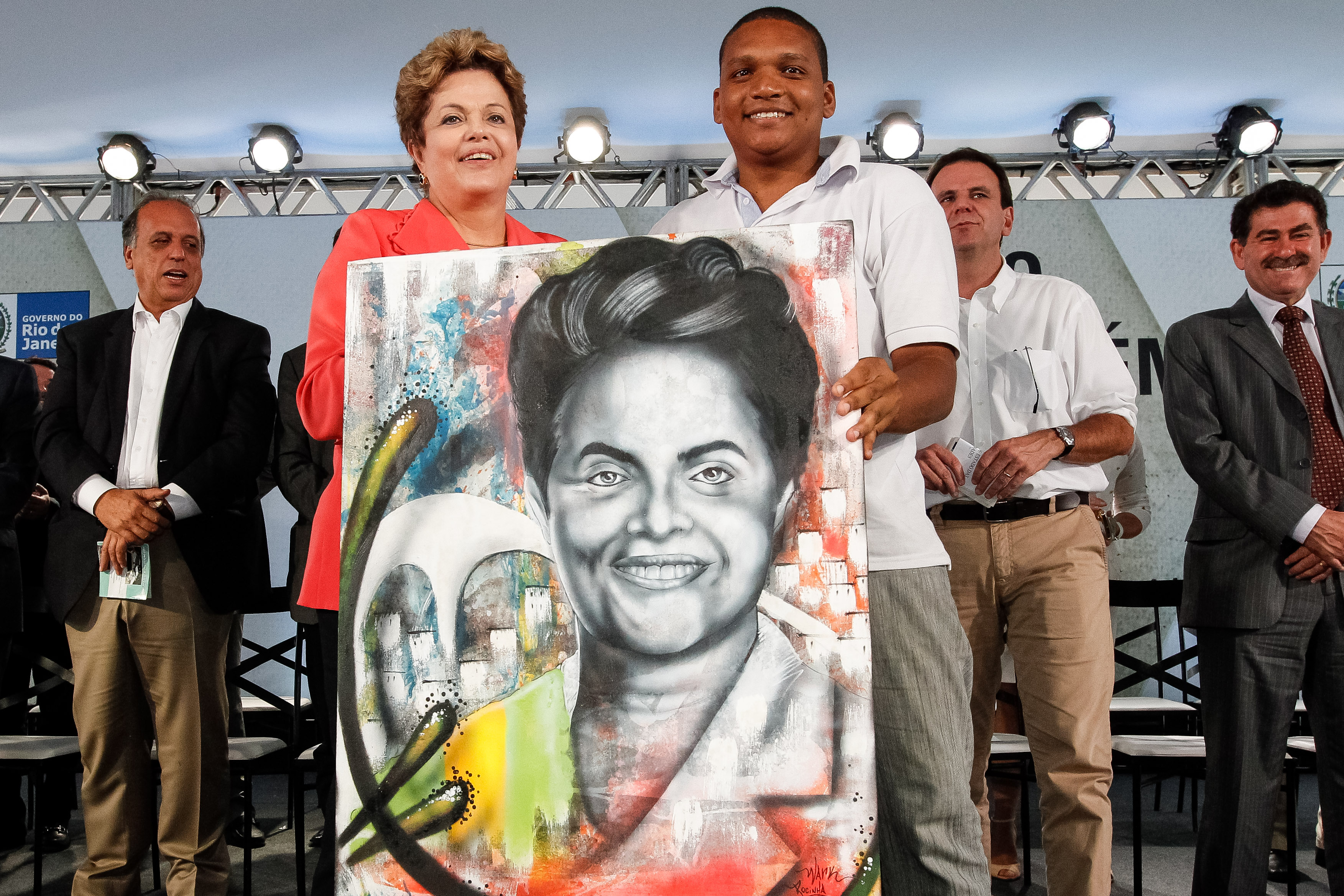 Presidenta Dilma Rousseff recebe presente do artista plástico Wark da Rocinha durante cerimônia de anúncio de investimentos em infraestrutura