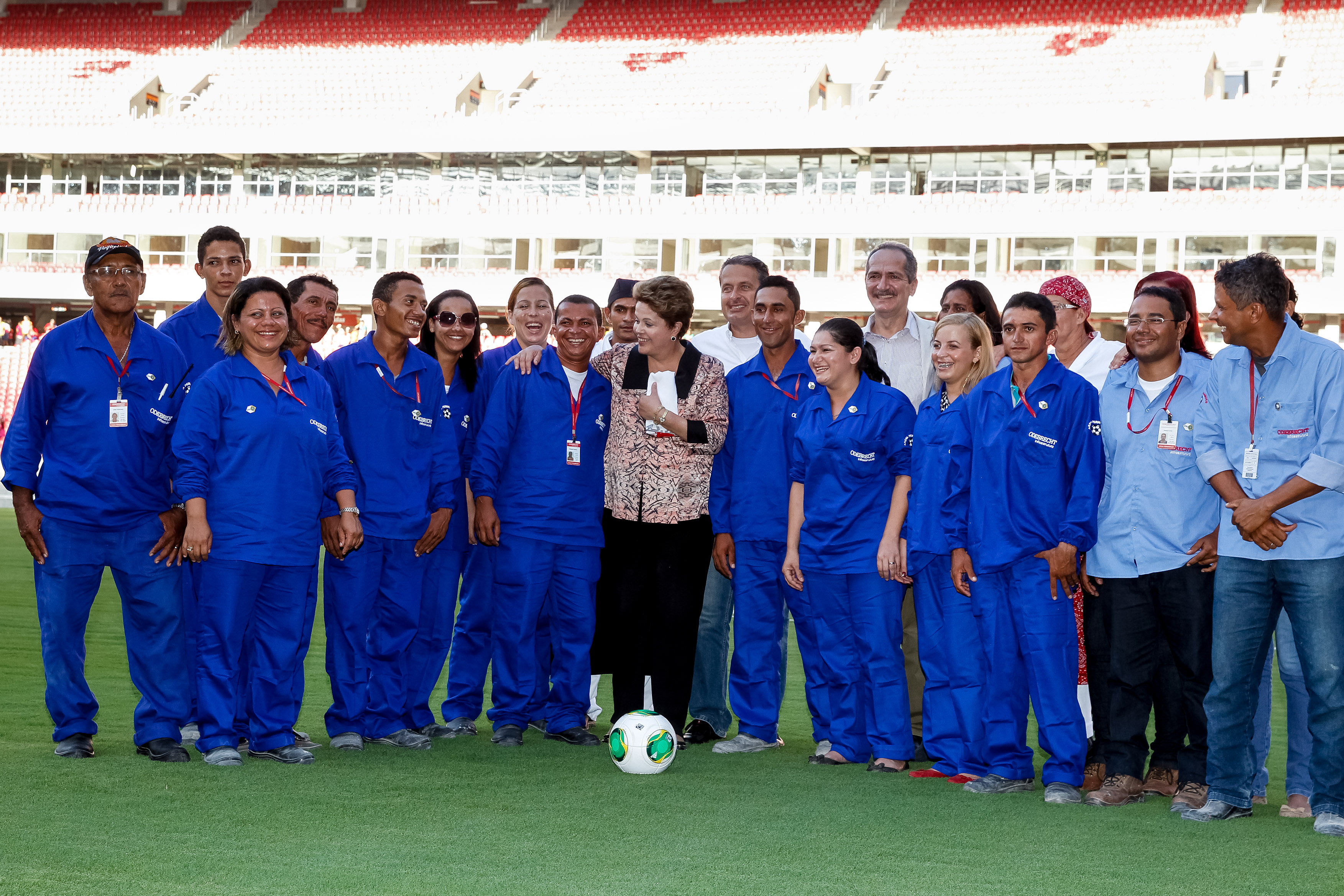 Presidenta Dilma Rousseff posa para foto com trabalhadores durante o primeiro Evento-Teste da Arena Pernambuco. (São Lourenço da Mata - PE 20/05/2013)