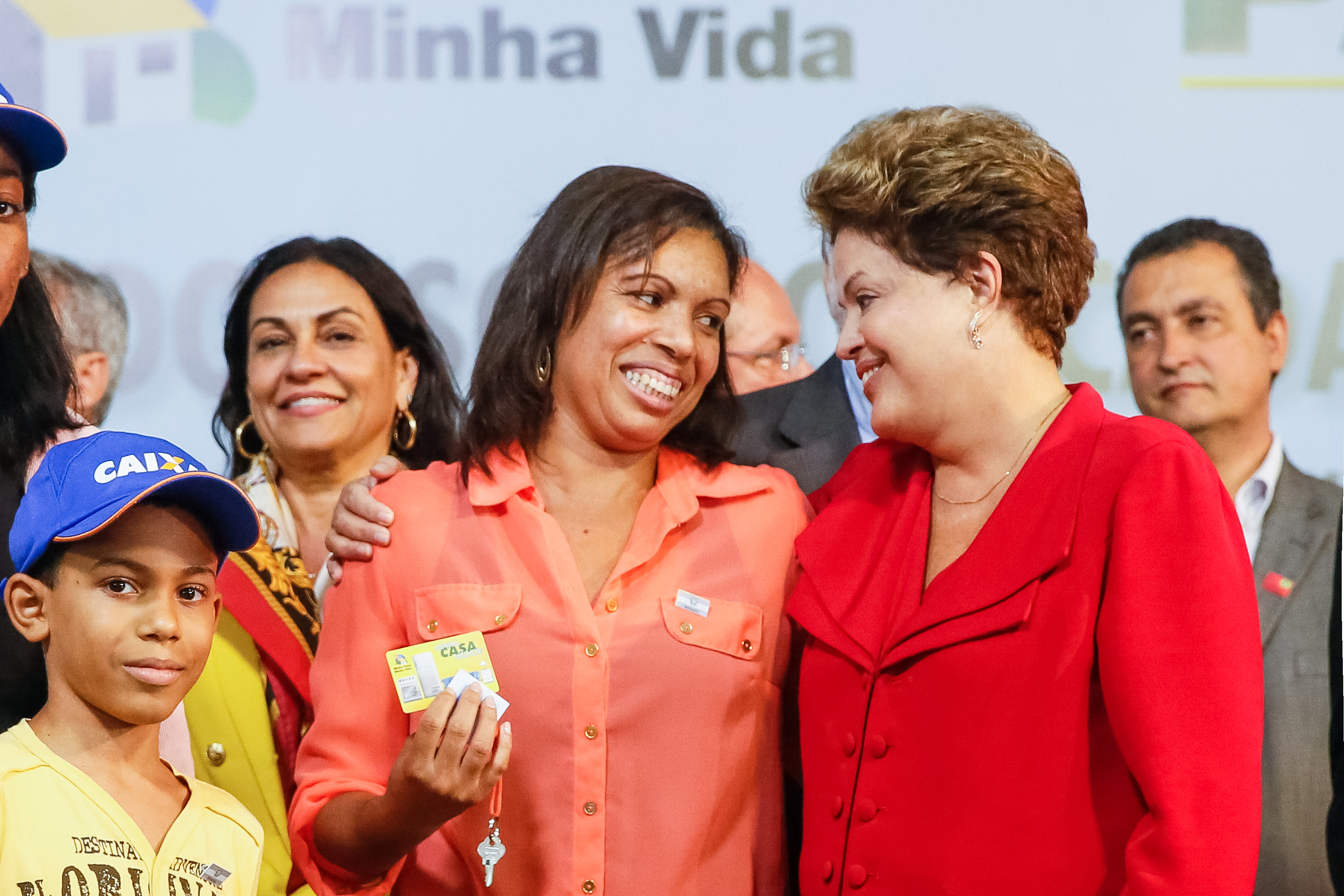 Presidenta Dilma Rousseff entrega à senhora Marizete Figueredo Santos e família o cartão "Minha Casa Melhor" e a chave de sua unidade habitacional, durante Cerimônia de entrega de 1.224 unidades habitacionais dos Residenciais EcoParque 2 e Viver Iguatemi, do programa Minha Casa Minha Vida. (Feira de Santana - BA, 29/04/2014)