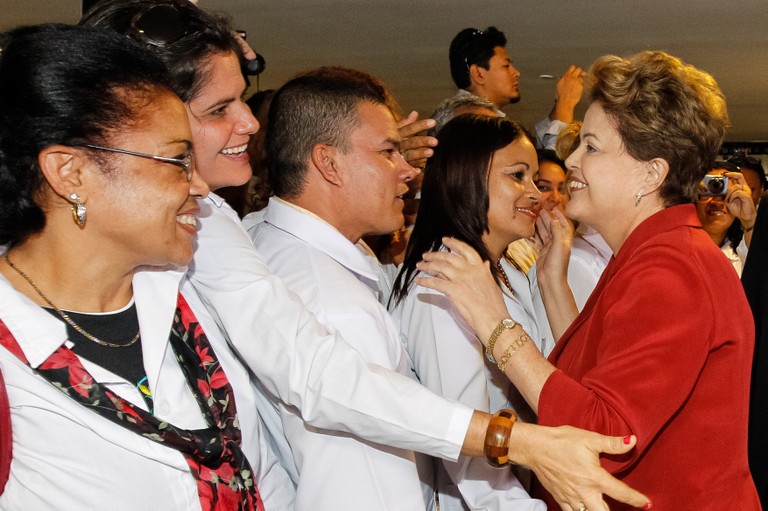 Presidenta Dilma Rousseff cumprimenta e posa para foto com os médicos após sanção da lei que institui o Programa Mais Médicos. (Brasília - DF, 22/10/2013)