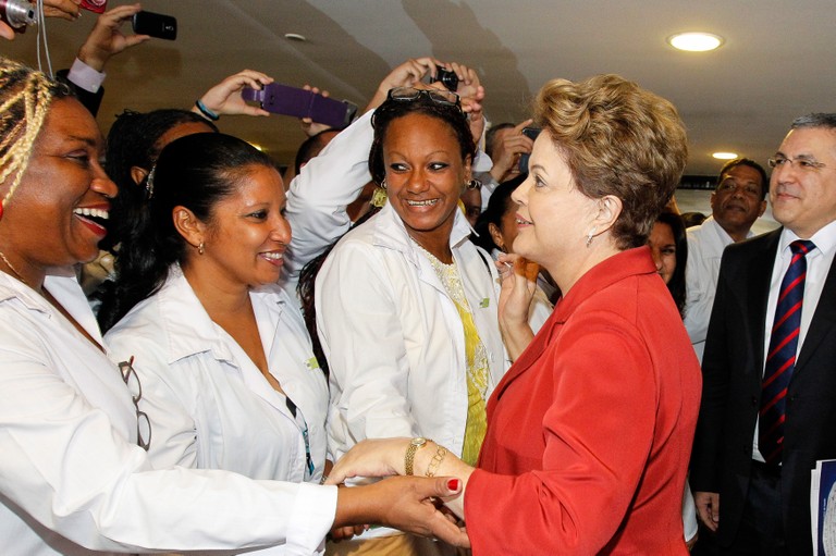 Presidenta Dilma Rousseff cumprimenta e posa para foto com os médicos após sanção da lei que institui o Programa Mais Médicos. (Brasília - DF, 22/10/2013)