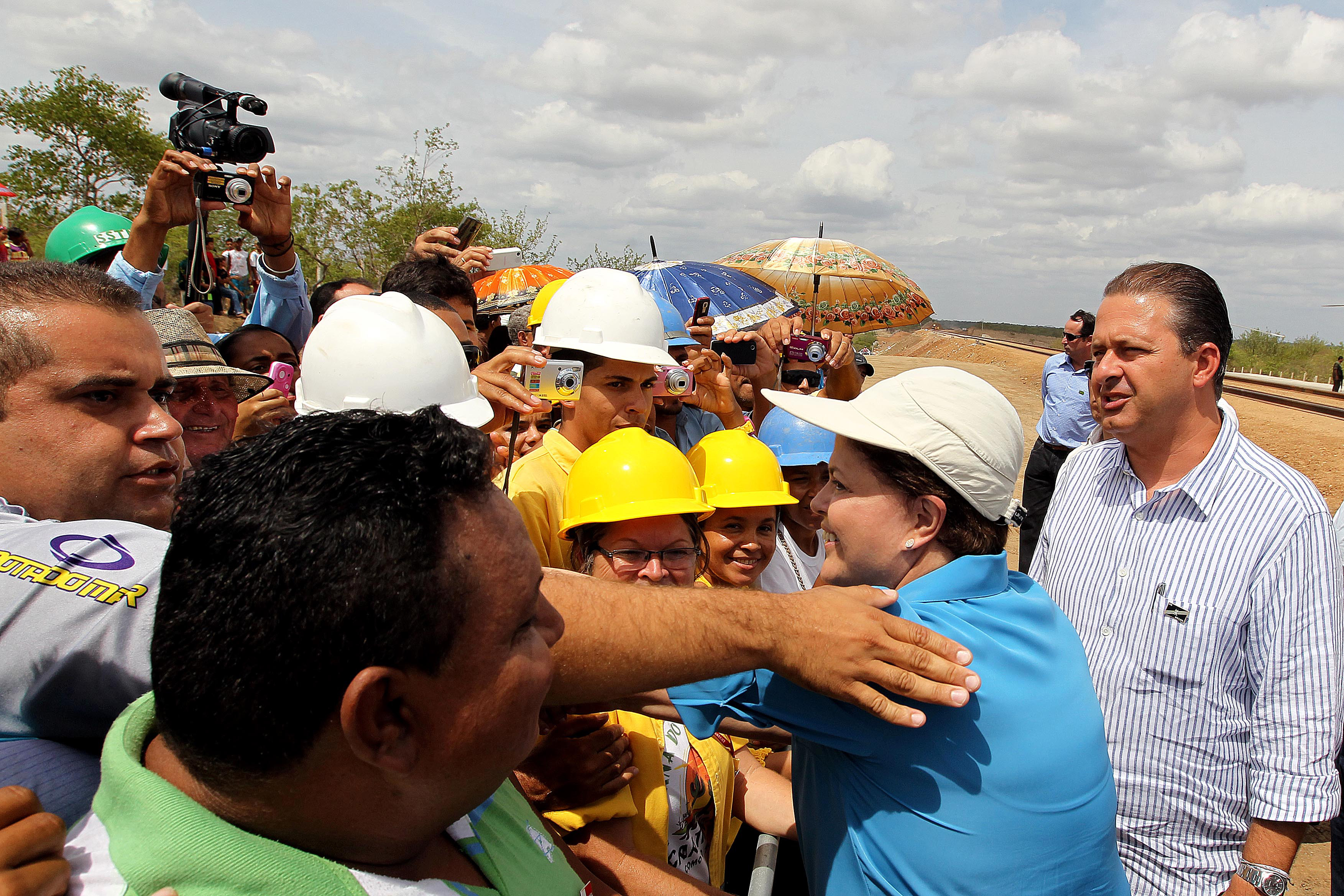 Presidenta Dilma Rousseff cumprimenta trabalhadores e populares, durante vistoria à frente de lançamento da superestrutura da malha ferroviária do Lote TS1. (Parnamirim - PE, 09/02/2012)