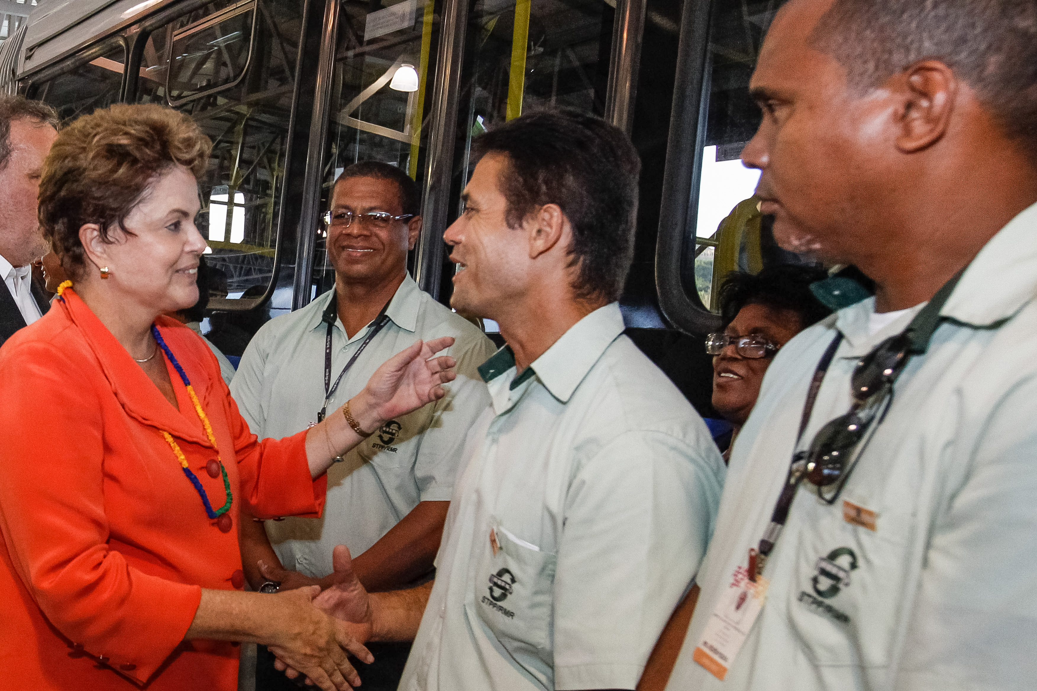 Presidenta Dilma Rousseff cumprimenta e posa para foto com motoristas de ônibus do BRT, durante visita ao terminal Cosme e Damião. (Recife - PE 13/06/2014)