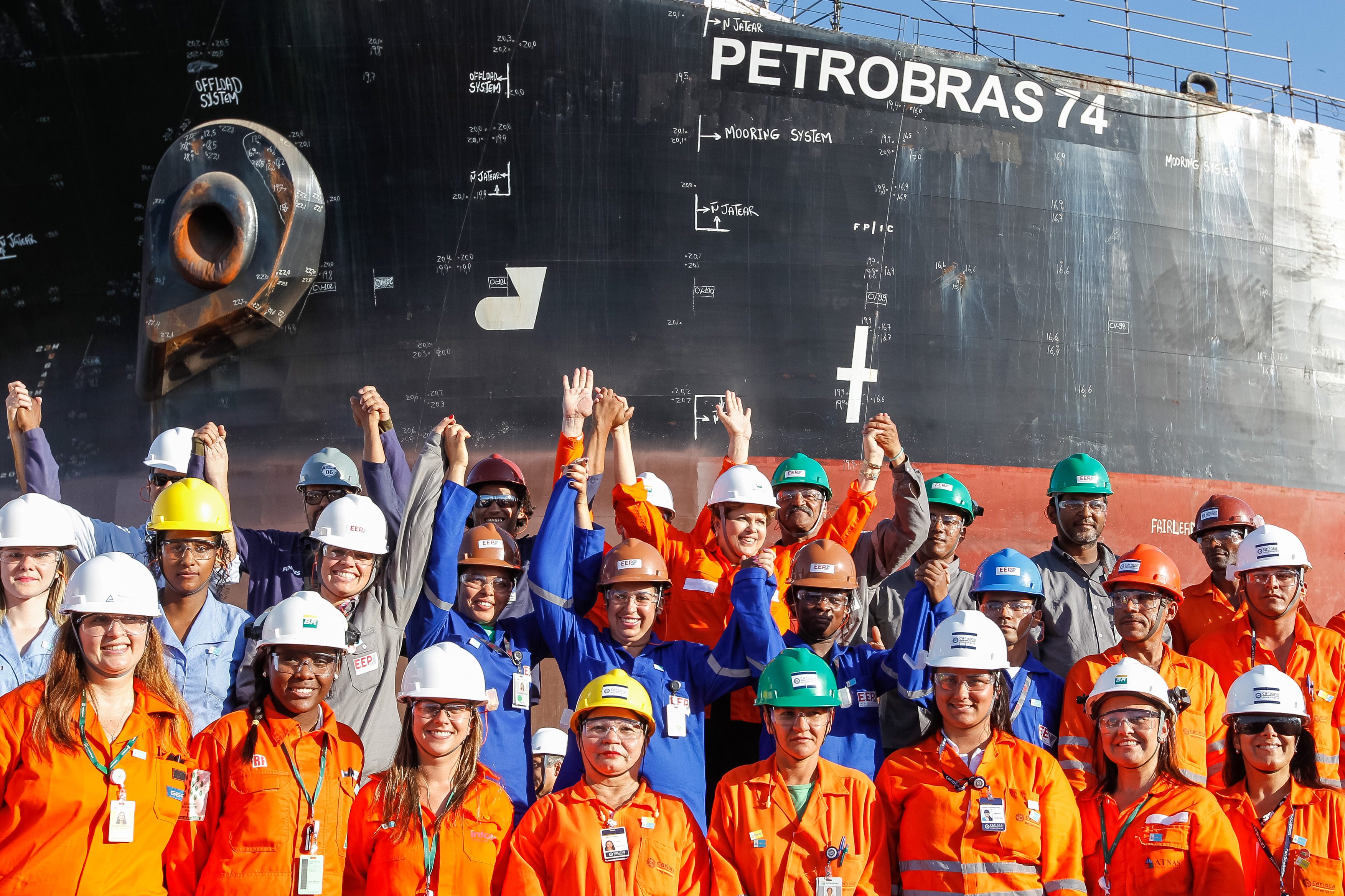Presidenta Dilma Rousseff, posa para foto com trabalhadores durante visita às obras da P-74 no Estaleiro Inhaúma. (Rio de Janeiro - RJ, 11/09/2013)