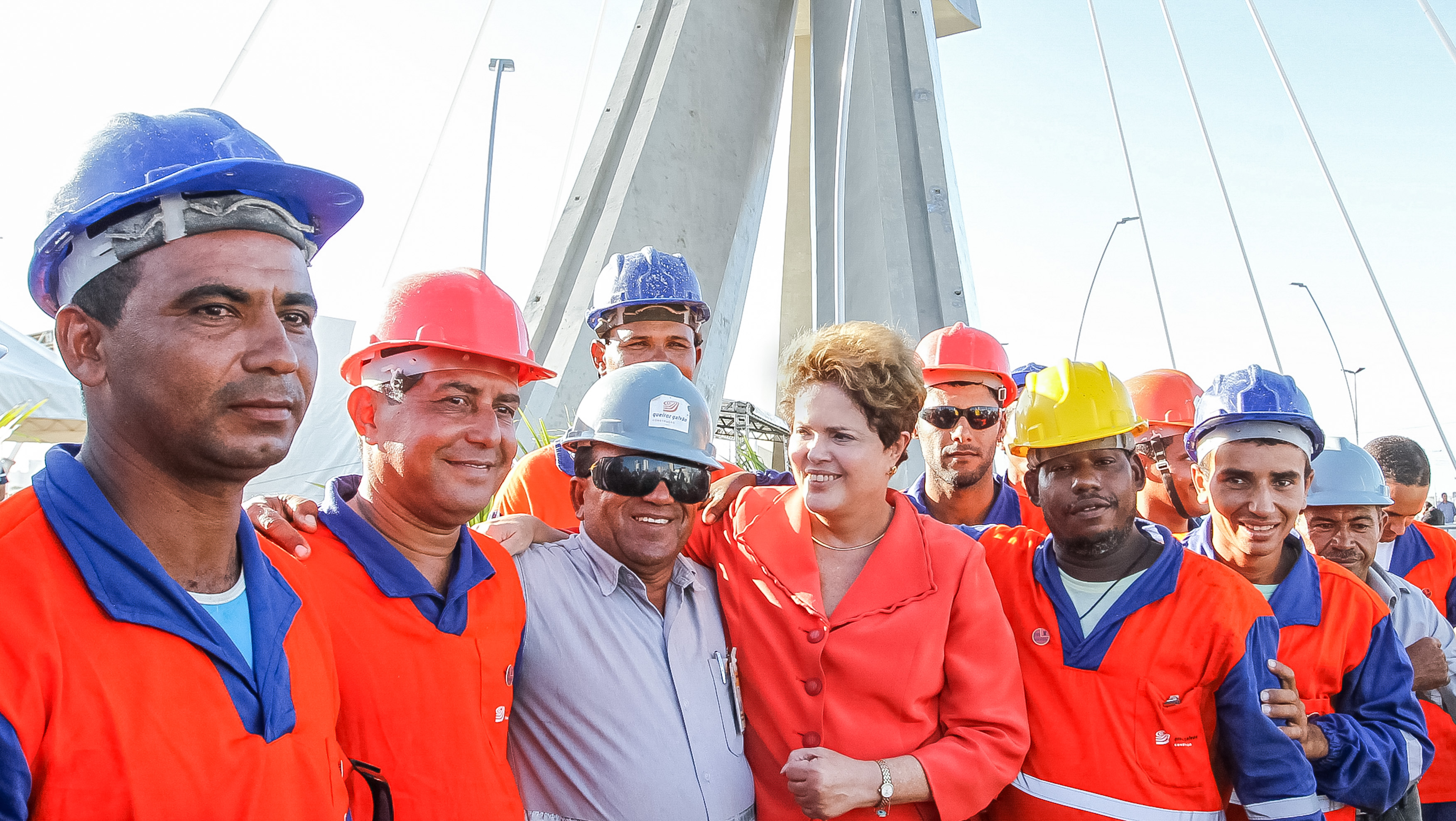 Presidenta Dilma Rousseff posa para foto com trabalhadores durante visita às obras e abertura ao tráfego da Pista Oeste do Corredor Via Mangue. (Recife - PE, 13/06/2014)