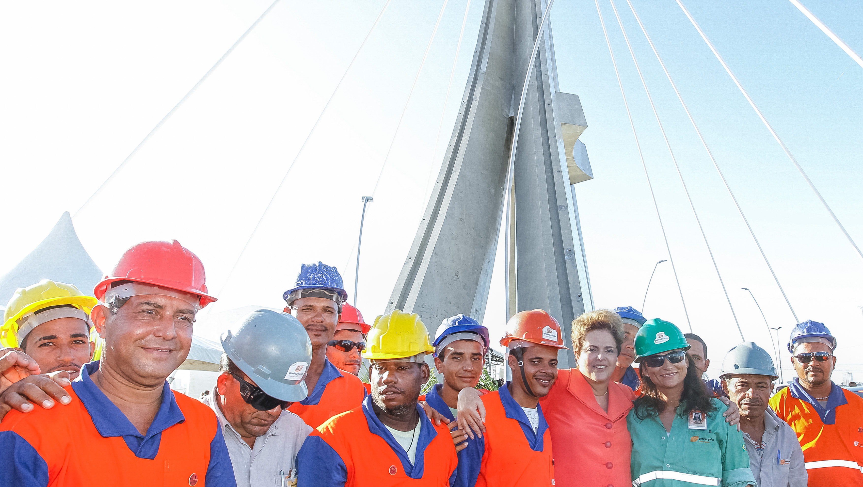 Presidenta Dilma Rousseff posa para foto com trabalhadores durante visita às obras e abertura ao tráfego da Pista Oeste do Corredor Via Mangue. (Recife - PE, 13/06/2014)