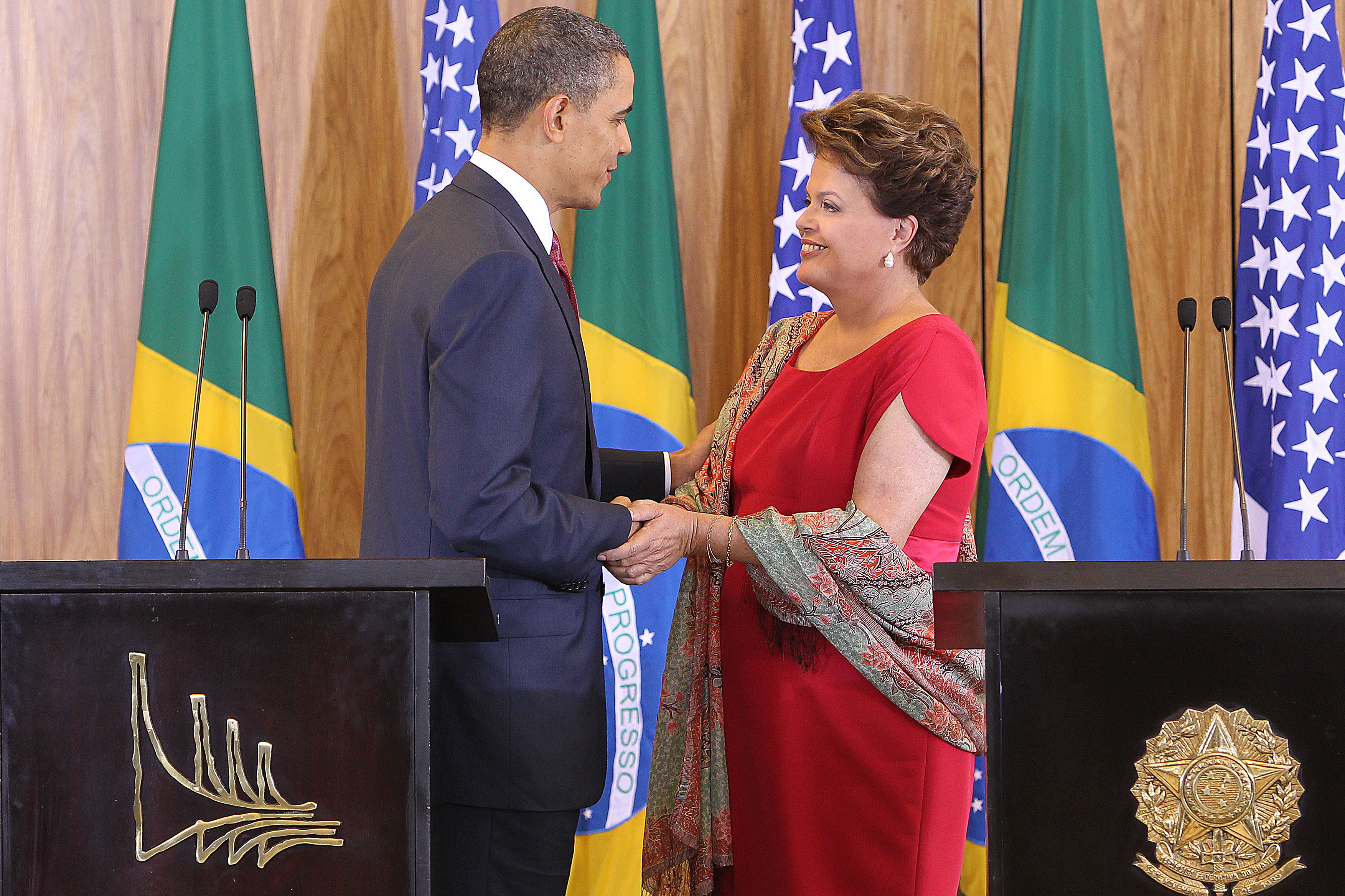 Presidenta Dilma Rousseff cumprimenta o presidente dos Estados Unidos, Barack Obama, na declaração à imprensa. Brasília-DF 19/03/2011