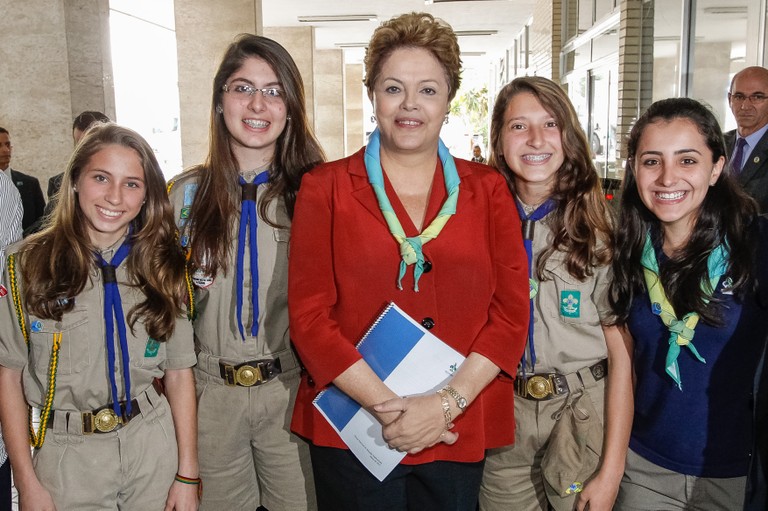 Presidenta Dilma Rousseff posa para foto com escoteiras, durante cerimônia de anúncio do PAC Mobilidade e de entrega de 57 Máquinas Motoniveladoras