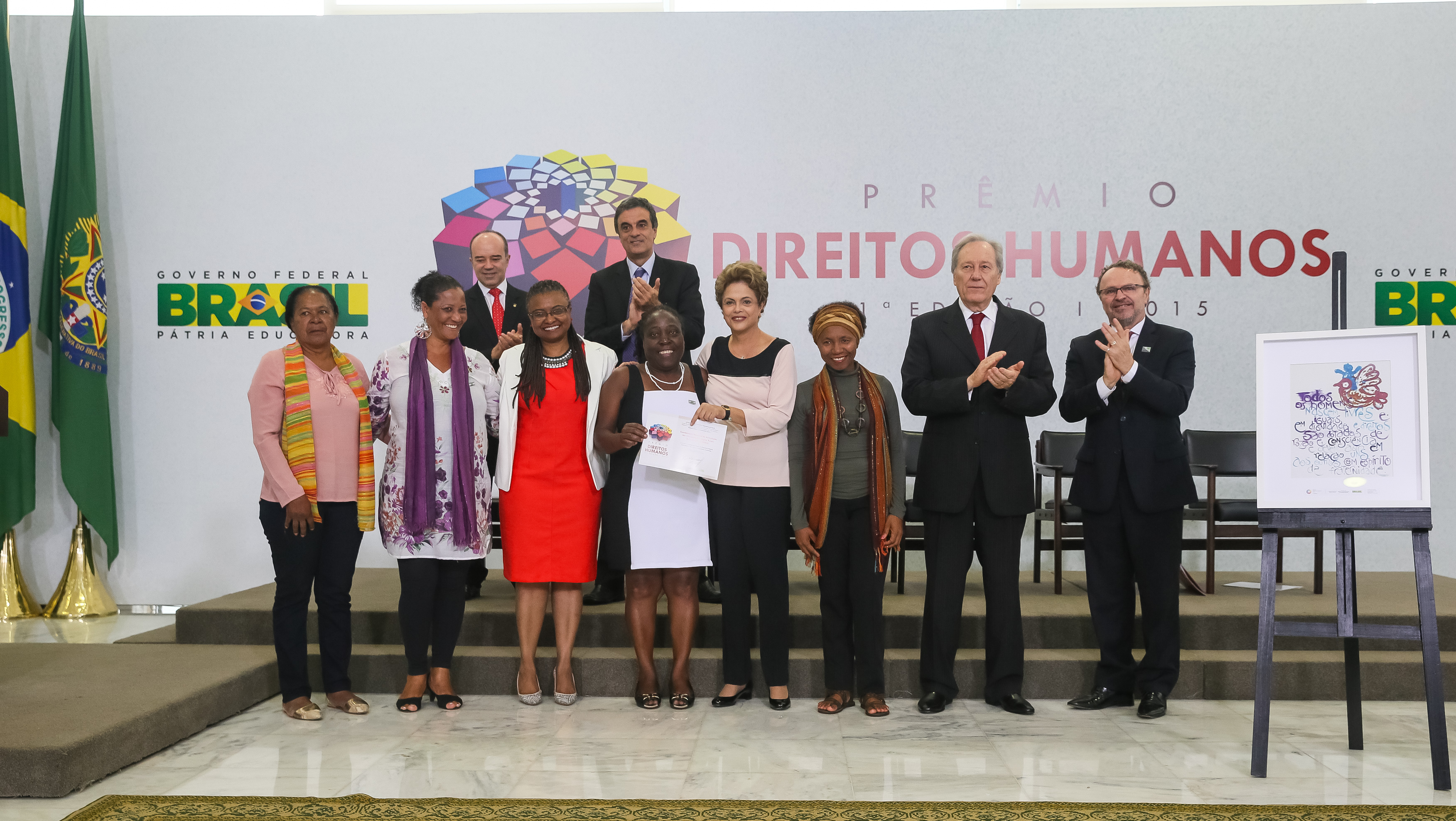 Presidenta Dilma Rousseff entrega o prêmio “Categoria Garantia dos Direitos da População Indígena, Quilombolas e dos Povos e Comunidades Tradicionais” a Coordenação Nacional de Articulação das Comunidades Negras Rurais Quilombolas (CONAQ) representada por Sandra Maria Andrade, Ana Maria Santos da Cruz e Ivone Matos na entrega do Prêmio Direitos Humanos 2015 - 21ª Edição. Brasília-DF, 11/12/2015