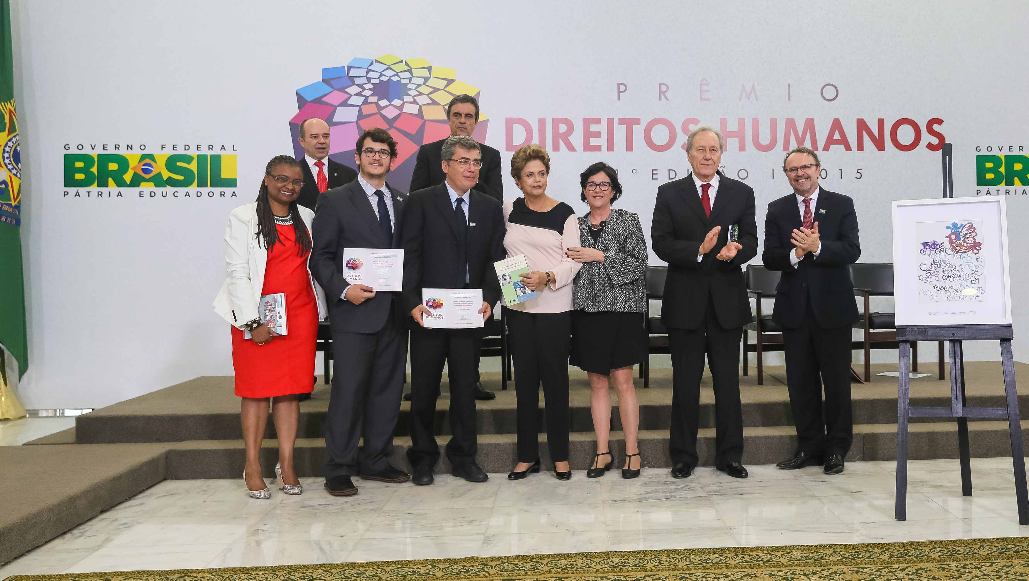 Presidenta Dilma Rousseff entrega o prêmio “Categoria Menção Honrosa” o Projeto Respeitar é Preciso!, de Promoção de Relações Mais Respeitosas em Ambiente Escolar, representada pelo Senhor Giordano Magri e Ivo Herzog e Ana Rosa Abreu na entrega do Prêmio Direitos Humanos 2015 - 21ª Edição. Brasília-DF, 11/12/2015
