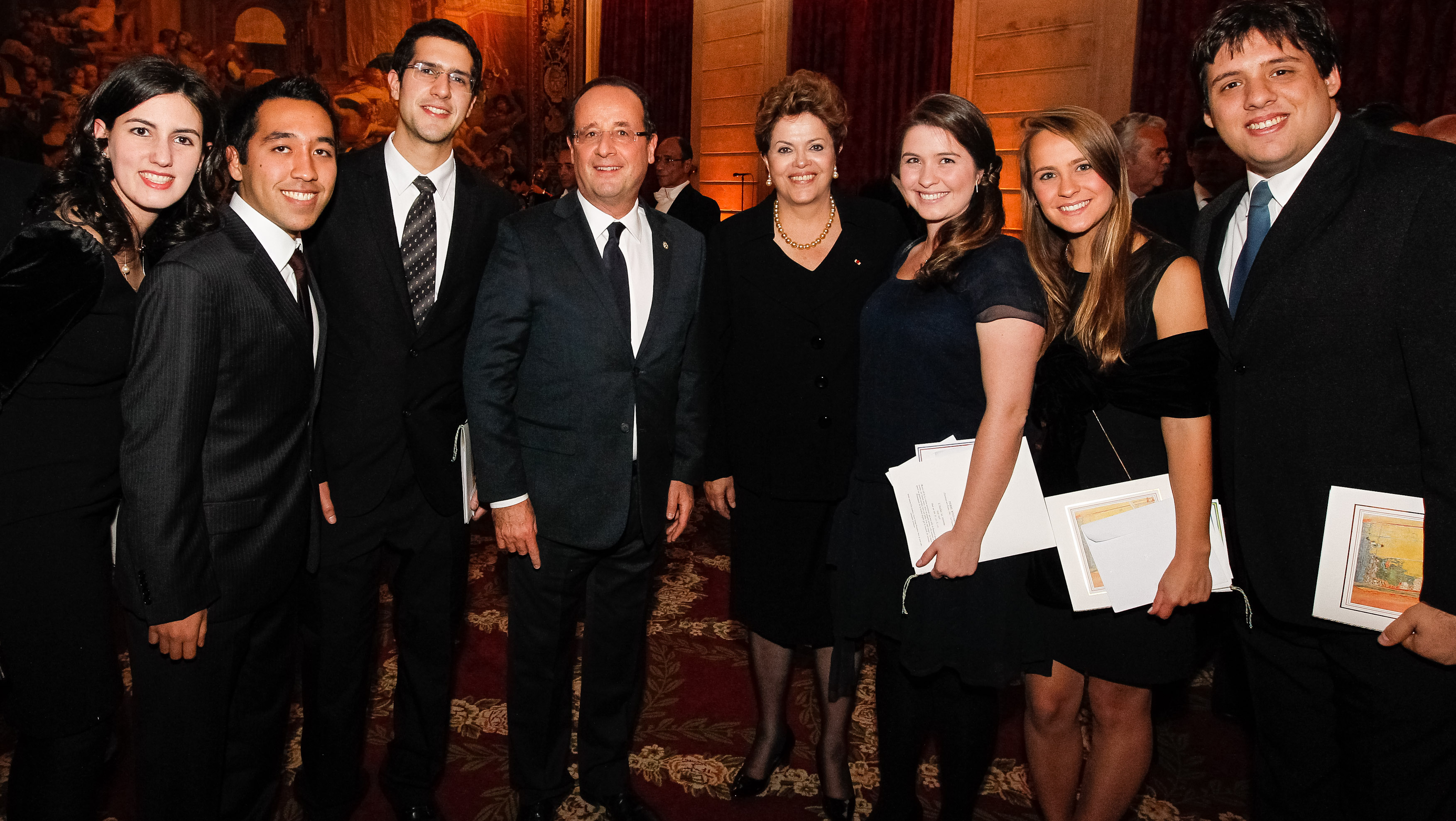 Presidenta Dilma Rousseff e o presidente da República Francesa, Sr. François Hollande, posam para foto com alunos brasileiros do " programa ciências sem fronteiras ". Paris - FR, 11/12/2012