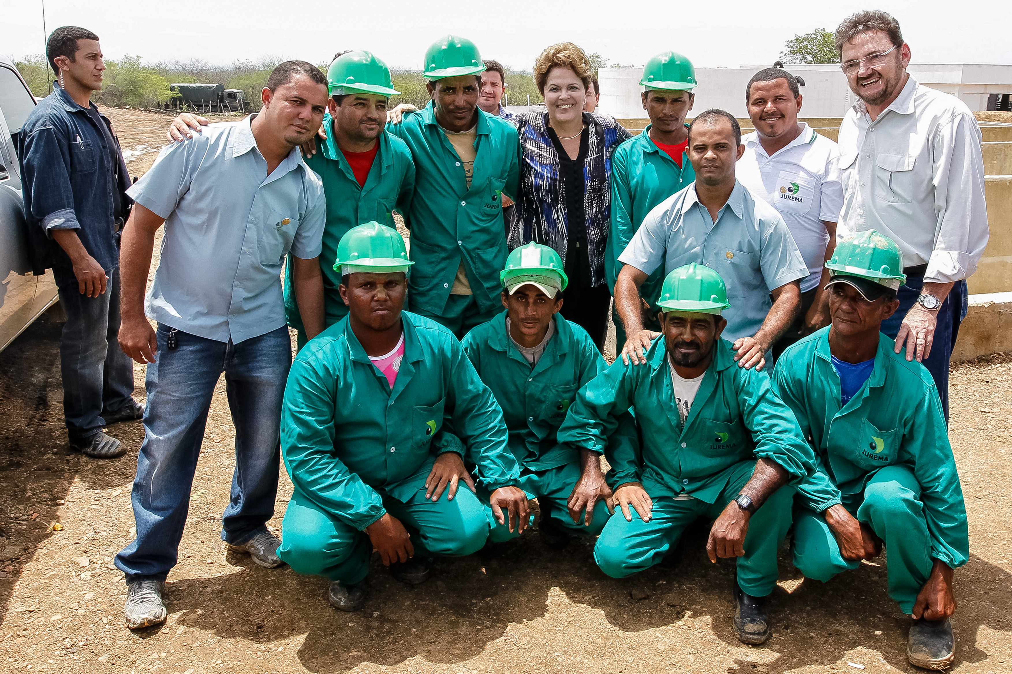 Presidenta Dilma Rousseff, posa para foto com trabalhadores das obras do sistema adutor de Piaus durante assinatura de ordens de serviço da Adutora Padre Lira, e do Projeto de Irrigação Marrecas/Jenipapo. São Julião - PI, 18/01/2013