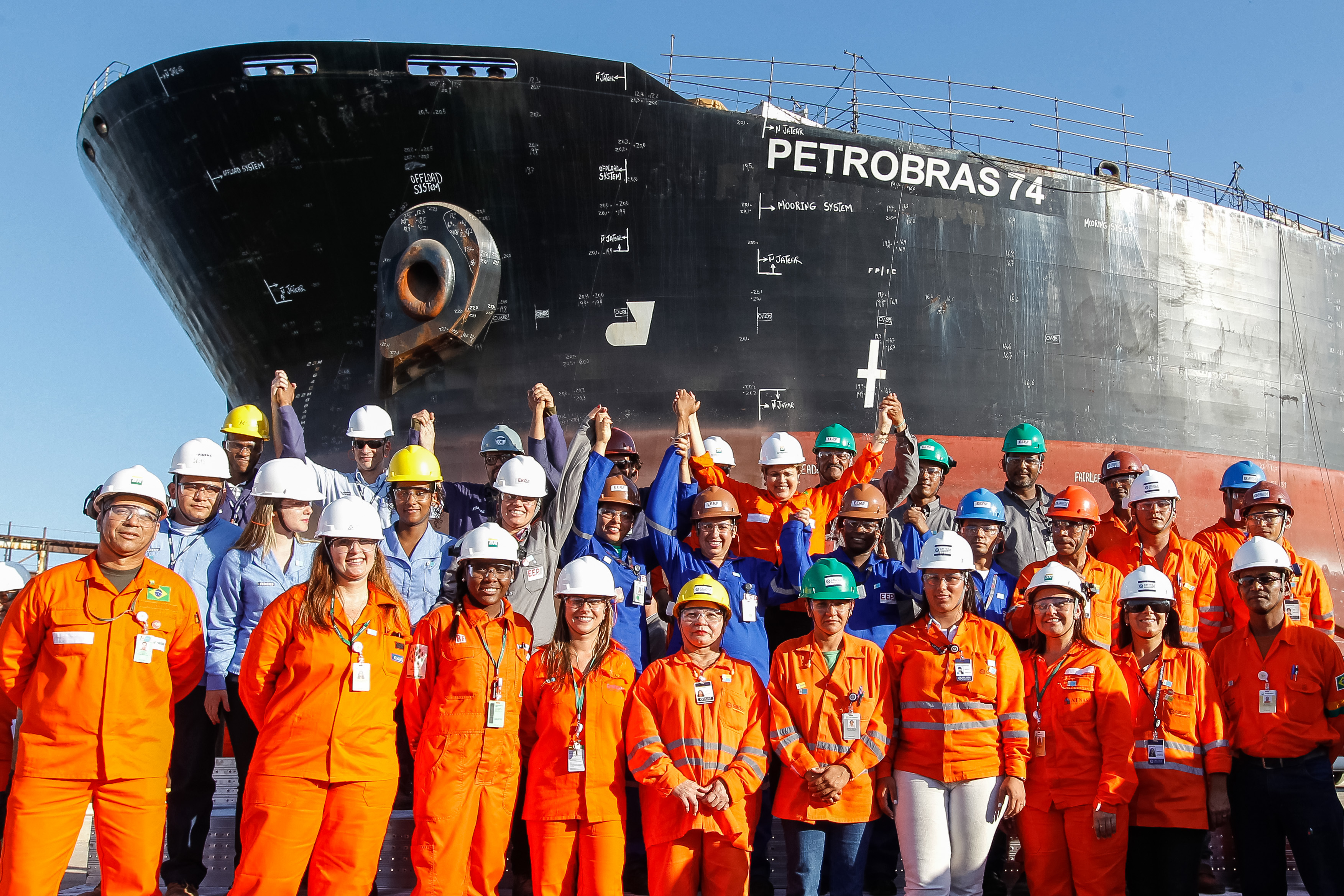 Presidenta Dilma Rousseff, posa para foto com trabalhadores durante visita às obras da P-74 no Estaleiro Inhaúma. Rio de Janeiro - RJ, 11/09/2013
