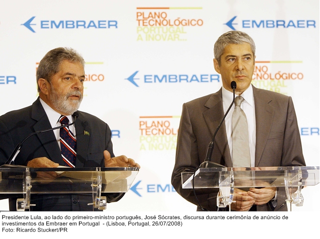Presidente Lula, ao lado do primeiro-ministro português, José Sócrates, discurso na cerimônia de anúncio de investimento da Embraer em Portugal.