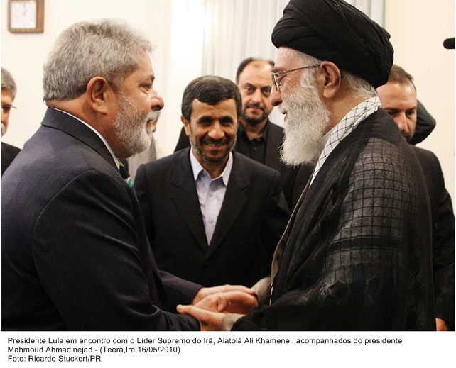 Presidente Lula em encontro com o Líder Supremo do Irã, Aiatolá Ali Khamenei, acompanhados do presidente Mahmoud Ahmadinejad.