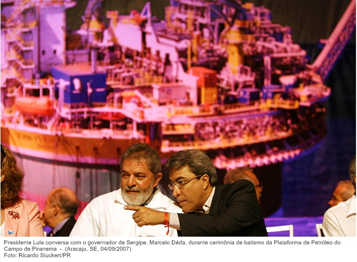 Presidente Lula conversa com o governador de Sergipe, Marcelo Déda, durante cerimônia de batismo da Plataforma de Petróleo do Campo de Piranema.
