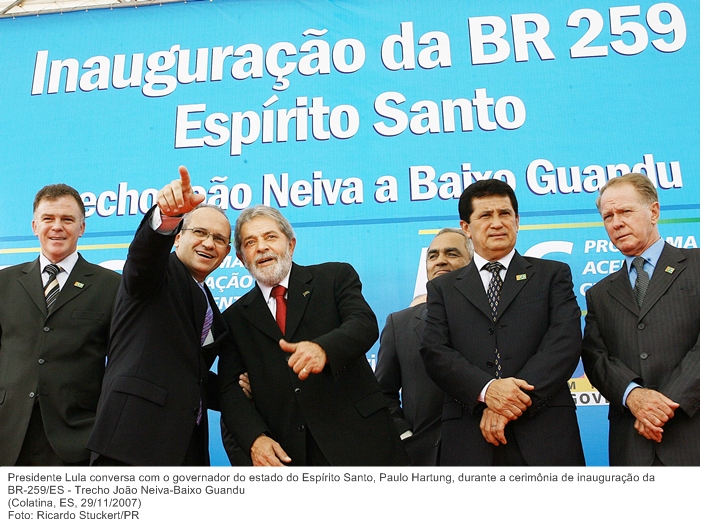 Presidente Lula conversa com o governador do estado do Espírito Santo, Paulo Hartung, durante a cerimônia de inauguração da BR-259ES - Trecho João Neiva-Baixo Guandu.