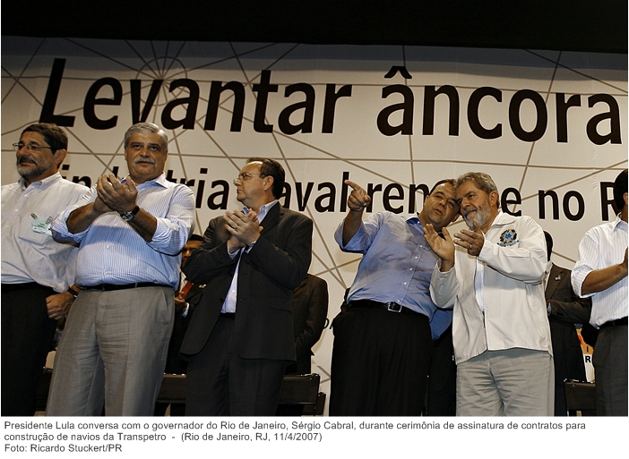 Presidente Lula conversa com o governador do Rio de Janeiro, Sérgio Cabral, durante cerimônia de assinatura de contratos para construção de navios da Transpetro.