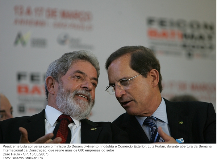 Presidente Lula conversa com o ministro do Desenvolvimento, Indústria e Comércio Exterior, Luiz Furlan, durante abertura da Semana Internacional da Construção.