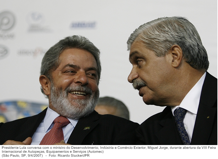 Presidente Lula conversa com o ministro do Desenvolvimento, Indústria e Comércio Exterior, Miguel Jorge, durante abertura da VIII Feira Internacional de Autopeças, Equipamentos e Serviços.