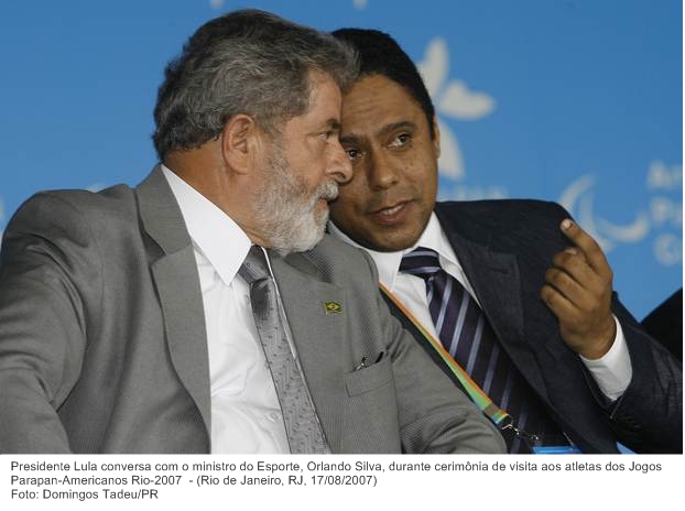 Presidente Lula conversa com o ministro do Esporte, Orlando Silva, durante cerimônia de visita aos atletas dos Jogos Parapan-Americanos Rio-2007.