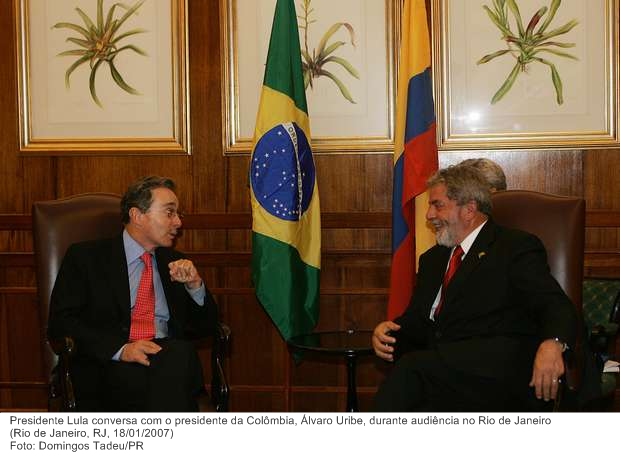 Presidente Lula conversa com o presidente da Colômbia, Álvaro Uribe, durante audiência no Rio de Janeiro.