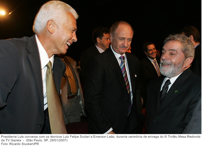 Presidente Lula conversa com os técnicos Luiz Felipe Scolari e Emerson Leão, durante cerimônia de entrega do III Troféu Mesa Redonda da TV Gazeta.