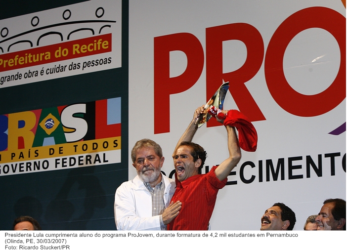 Presidente Lula cumprimenta aluno do programa ProJovem, durante formatura de 4,2 mil estudantes em Pernambuco.