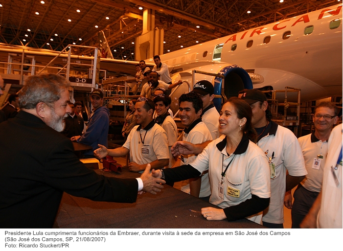 Presidente Lula cumprimenta funcionários da Embraer, durante visita à sede da empresa em São José dos Campos.