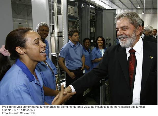 Presidente Lula cumprimenta funcionários da Siemens, durante visita às instalações da nova fábrica em Jundiaí.