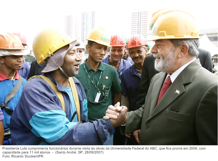 Presidente Lula cumprimenta funcionários durante visita às obras da Universidade Federal do ABC, que fica pronta em 2009, com capacidade para 11 mil alunos.
