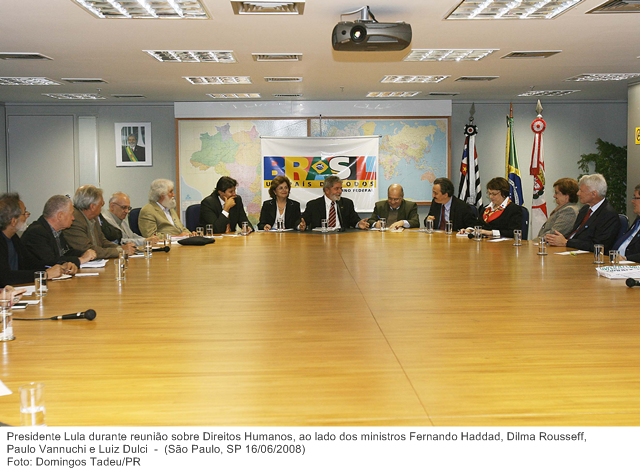 Presidente Lula durante reunião sobre Direitos Humanos, ao lado dos ministros Fernando Haddad, Dilma Rousseff, Paulo Vannuchi e Luiz Dulci.