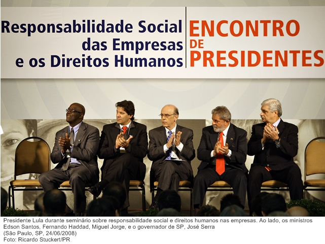 Presidente Lula durante seminário sobre responsabilidade social e direitos humanos nas empresas. Ao lado, os ministros Edson Santos, Fernando Haddad, Miguel Jorge, e o governador de SP, José Serra.